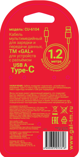 Зарядный кабель GAL CU-6104 USB A-TYPE C 3А 1.2M
