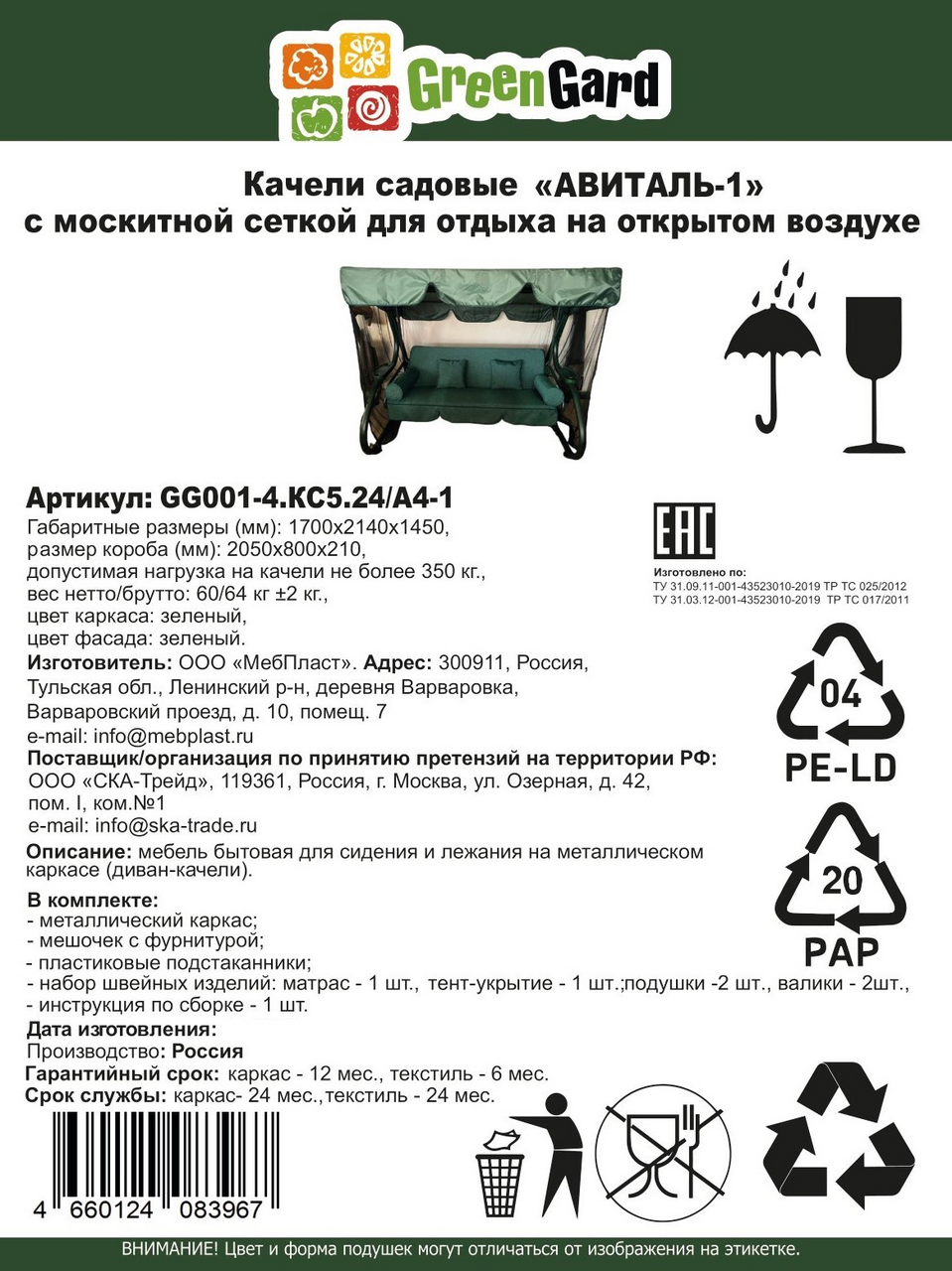 - Комплектация Качели с тентом - 1 шт.