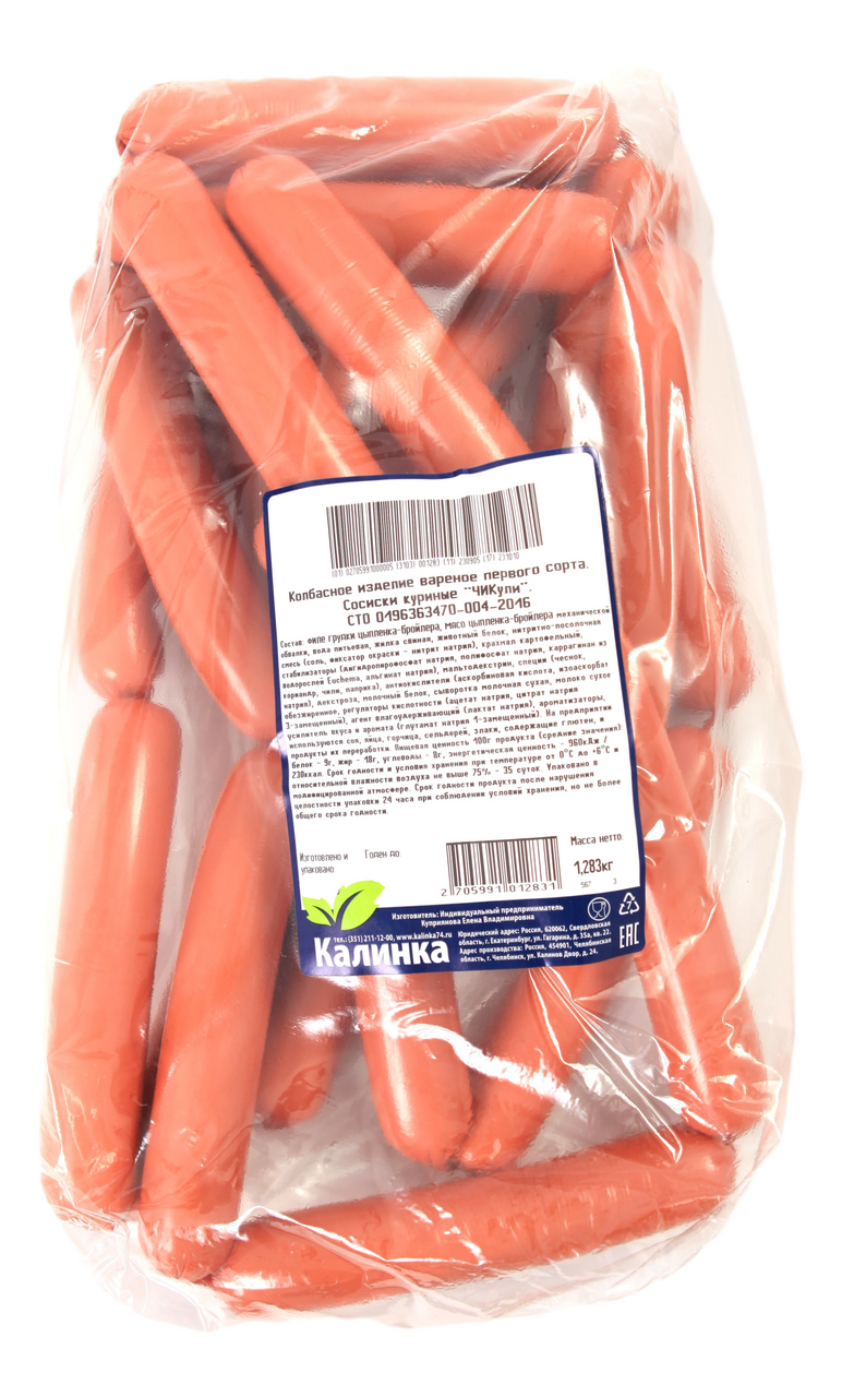 Сосиски Калинка Рябушка, ~1кг – мясной продукт, приготовленный по классической рецептуре. Сочные, нежные с приятным вкусом и пикантным ароматом. Плотная, равномерная консистенция без хрящей и прожилок, сосиски не разваливаются и крошатся, после варки остаются в первоначальном виде. Продукт можно употреблять, как самостоятельное блюдо, а также в виде добавки к картофельному пюре, макаронам, любой каше. Отличный вариант к пицце, можно положить в яичницу, потушить с капустой. Это любимый всеми продукт и к тому же питательный, быстро утоляет голод и насыщает положительной энергией.