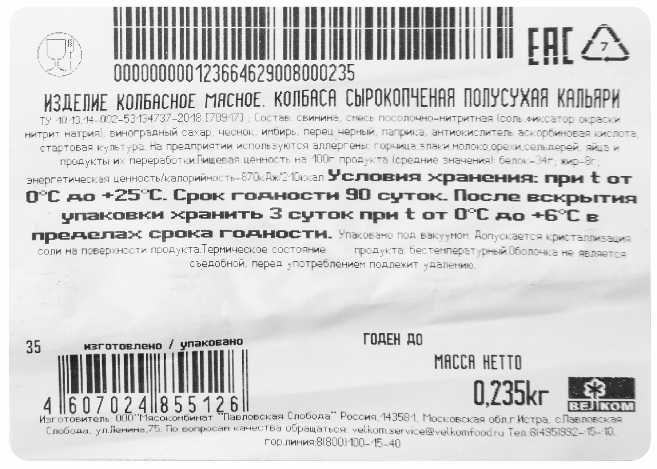 Колбаса Велком Кальяри сырокопченая, 235г от отечественного производителя Павловская слобода обладает натуральным мясным вкусом и изготавливается по всем правилам сырокопчения. Натуральная оболочка плотно набита фаршем из высококлассной свинины и говядины. Производитель не использует генетически модифицированные продукты в рецептуре. Колбаса Кальяри Велком с/к, 235г прекрасно подходит для создания мясных ассорти, бутербродов, а также придает вкус и аромат копчения первым и вторым горячим блюдам.