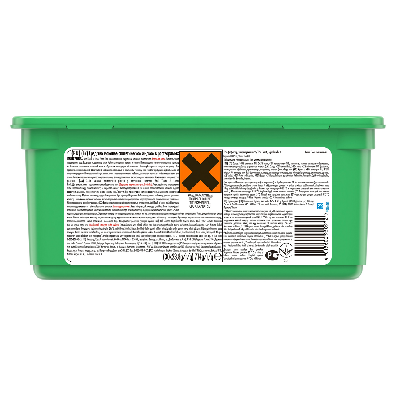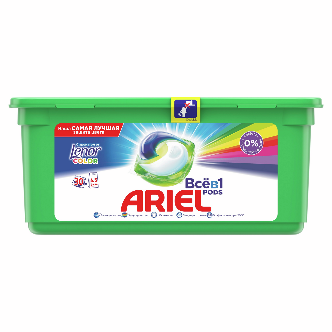 Невероятная чистота в одной маленькой капсуле. Капсулы для стирки Ariel Pods Всё-в-1 Touch of Lenor Color имеют уникальный многосекционный дизайн, позволяющий надежно сохранять компоненты в отдельных секциях капсулы до начала стирки, и обладают высококонцентрированными очищающими свойствами. Инновационная пленка капсул для стирки Ariel полностью растворяется при контакте с водой, позволяя мощным технологиям удалять различные виды пятен. Одна капсула содержит необходимую для стирки дозу лучшего жидкого средства от Ariel. Используйте в сочетании с кондиционерами для белья Lenor для придания дополнительной мягкости и свежести. ВНИМАНИЕ. Этот продукт может быть опасен и может нанести серьезные травмы. Храните капсулы Ariel Pods в недоступном для детей месте. Чтобы узнать больше, посетите веб-сайт www.ariel-russia.ru/ru-ru