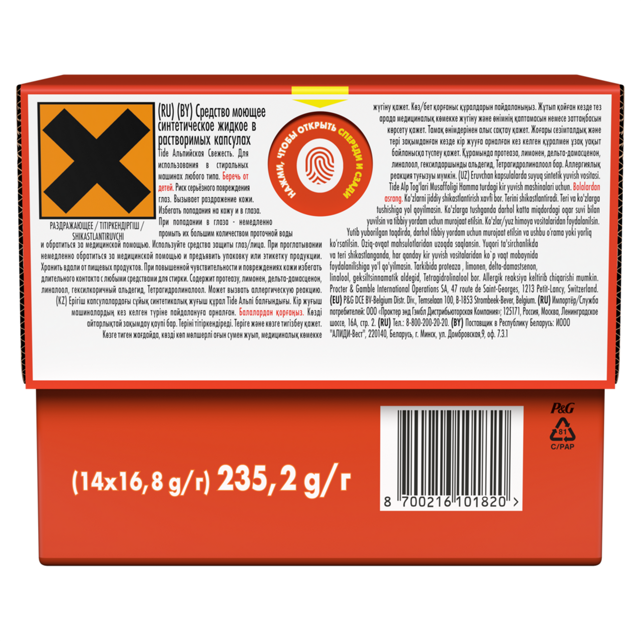Капсулы для стирки Tide Альпийская свежесть 14 штук предназначены для белого и цветного белья. Каждая капсула состоит из трех секций, включая мощные активные вещества для очищения, удаления сложных пятен и усовершенствованную систему защиты белого. Оболочка растворяется даже в холодной воде. Просто загрузите капсулу Tide в барабан стиральной машины до загрузки белья и наслаждайтесь кристальной чистотой! Tide капсулы прекрасно очищают даже загрязнения в сложных зонах, таких как воротнички, манжеты, зона подмышек. Преимущества жидкого средства для стирки в капсулах Tide: Прекрасно очищает и удаляет сложные пятна даже при 20С; Сохраняет ослепительную белизну; Защищает ткань; Придает белью приятный аромат альпийской свежести; Не содержит фосфатов и хлорных отбеливателей. Капсулы Tide также доступны в большой упаковке 30 штук с более выгодной ценой за стирку. ВНИМАНИЕ. Продукт может быть опасен. Берегите капсулы Tide от детей.