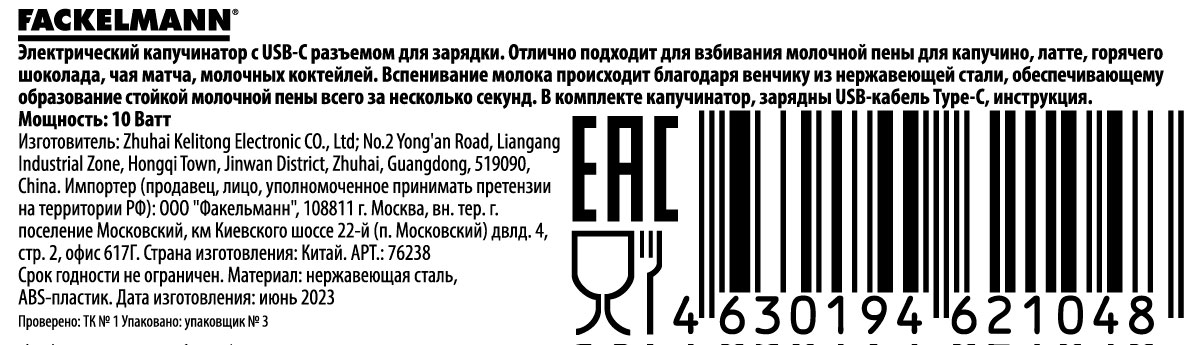 Капучинатор Fackelmann c USB-C разъемом для зарядки прекрасно подходит для взбивания молочной пены для капучино, латте, горячего шоколада, чая матча, молочных коктейлей. Эффектная нежная пенка образуется за счет работы венчика, выполненного из высококачественной нержавеющей стали. Он без труда помещается в любую чашку/кружку/стакан и взбивает пену. Так легко и просто вы получаете устойчивую молочную пенку для своег�� любимого напитка всего за несколько секунд. Корпус прибора стильного матового черного цвета эргономичной формы изготовлен из экологичного пластика. Капучинатор отличается хорошей сбалансированностью, не выскальзывает из рук в процессе взбивания и не представляет опасности в процессе эксплуатации. В качестве альтернативы прибор можно использовать для взбивания молока (в том числе растительного), сливок, белков, протеинового коктейля, заправки для салата, омлета, детского питания, чая матча и других компонентов, требующих создание воздушной консистенции. В набор с электрокапучинатором входят USB-кабель для зарядки, Тype-C, инструкция. Литиевая батарея прибора отличается экологичностью и долговечностью. Она дает возможность максимально быстро зарядить устройство до 100%. Полного заряда достаточно для приготовления нежнейшей молочной пенки на 30 чашек напитка. Уровень заряда отображается на специальном индикаторе, установленном на корпусе прибора. Оригинальная кнопка включения/выключения электрокапучинатора выполнена в виде CD-диска. Также в качестве преимуществ следует отметить пониженный уровень шума, мощное равномерное взбивание, при котором устройство практически не вибрирует, а также наличие специального паза, благодаря которому удается легко зафиксировать прибор в горизонтальном положении.