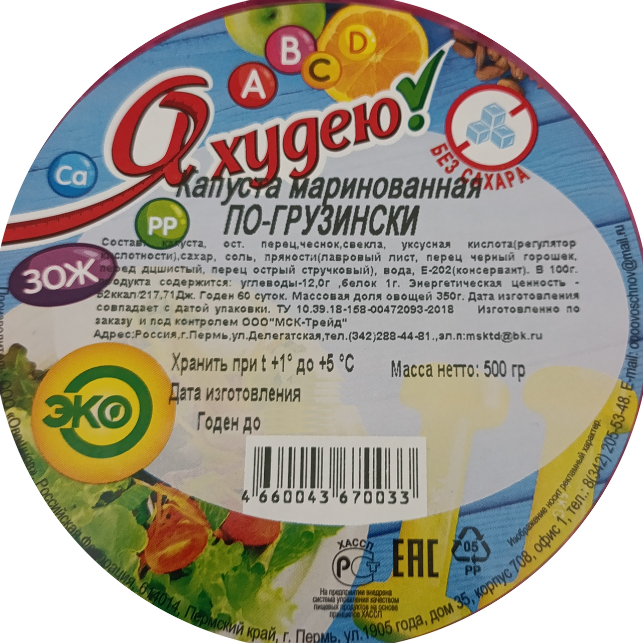 Капуста, острый перец, чеснок, свекла, уксусная кислота (регулятор кислотности), сахар, соль, пряности (лавровый лист, перец черный горошек, перец душистый, перец острый стручковый), вода, Е202 (консервант).