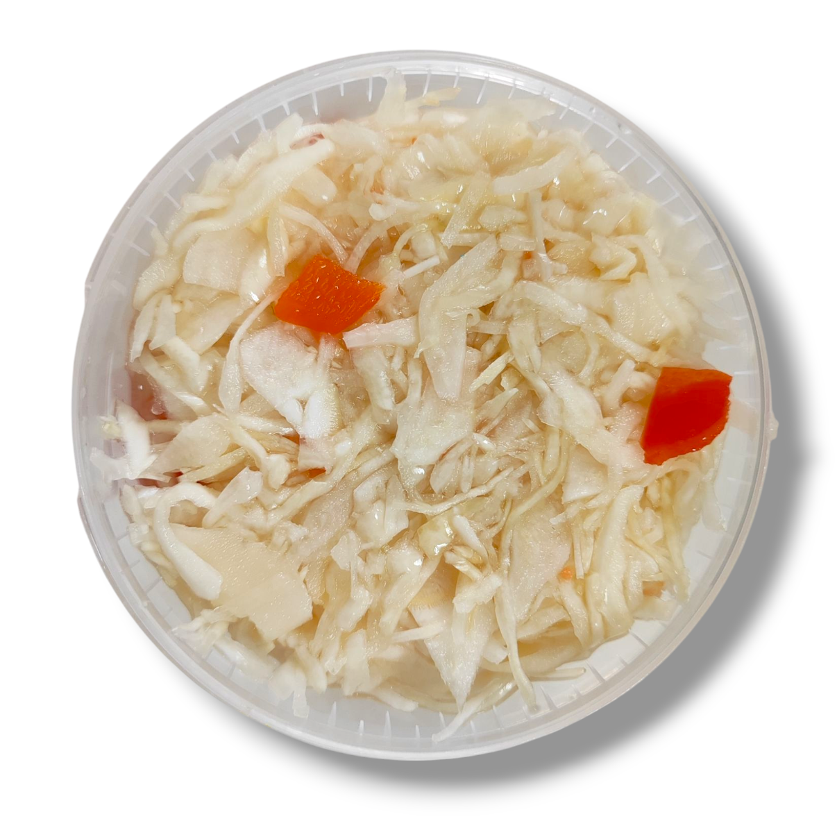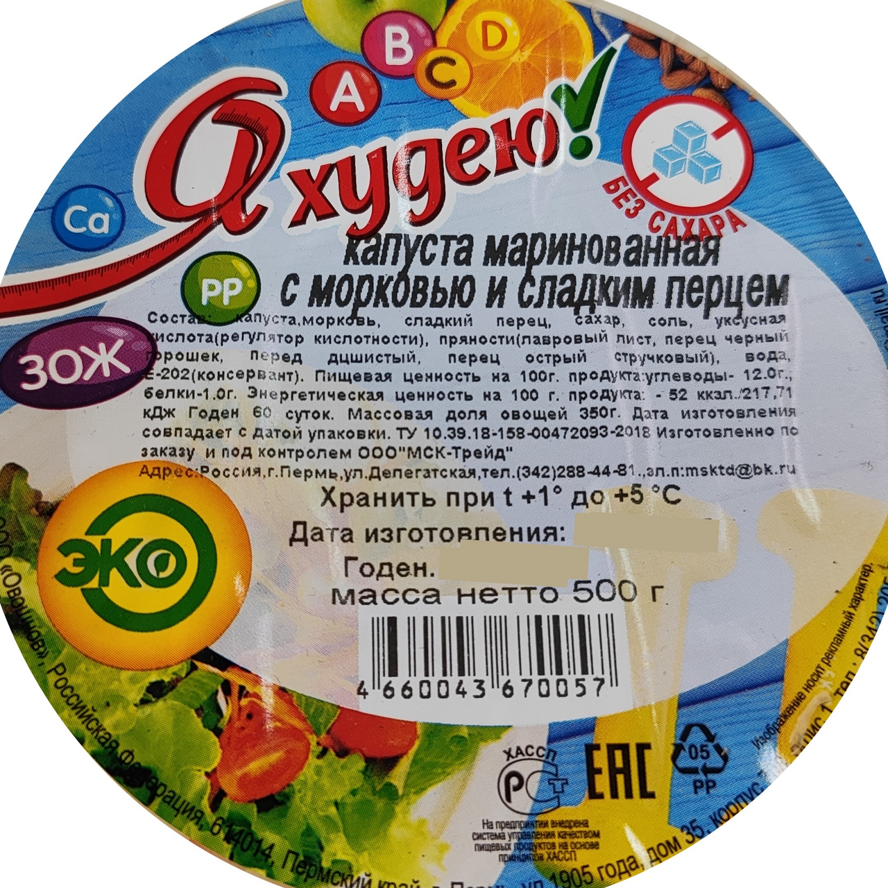 Капуста, морковь, сладкий перец, сахар, соль, уксусная кислота (регулятор кислотности), пряности (лавровый лист, перец черный горошек, перец душистый, перец острый стручковый), вода, Е202(консервант).