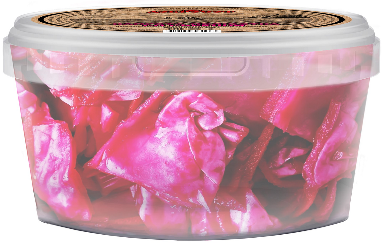 Капуста свежая, вода питьевая, свекла свежая, сахар, соль пищевая, регулятор кислотности уксусная кислота, чеснок, перец чили, перец душистый, лавровый лист, усилитель вкуса и аромата - глутамат натрия, консерванты-сорбат калия, бензоат натрия, антиокислитель-аскорбиновая кислота.