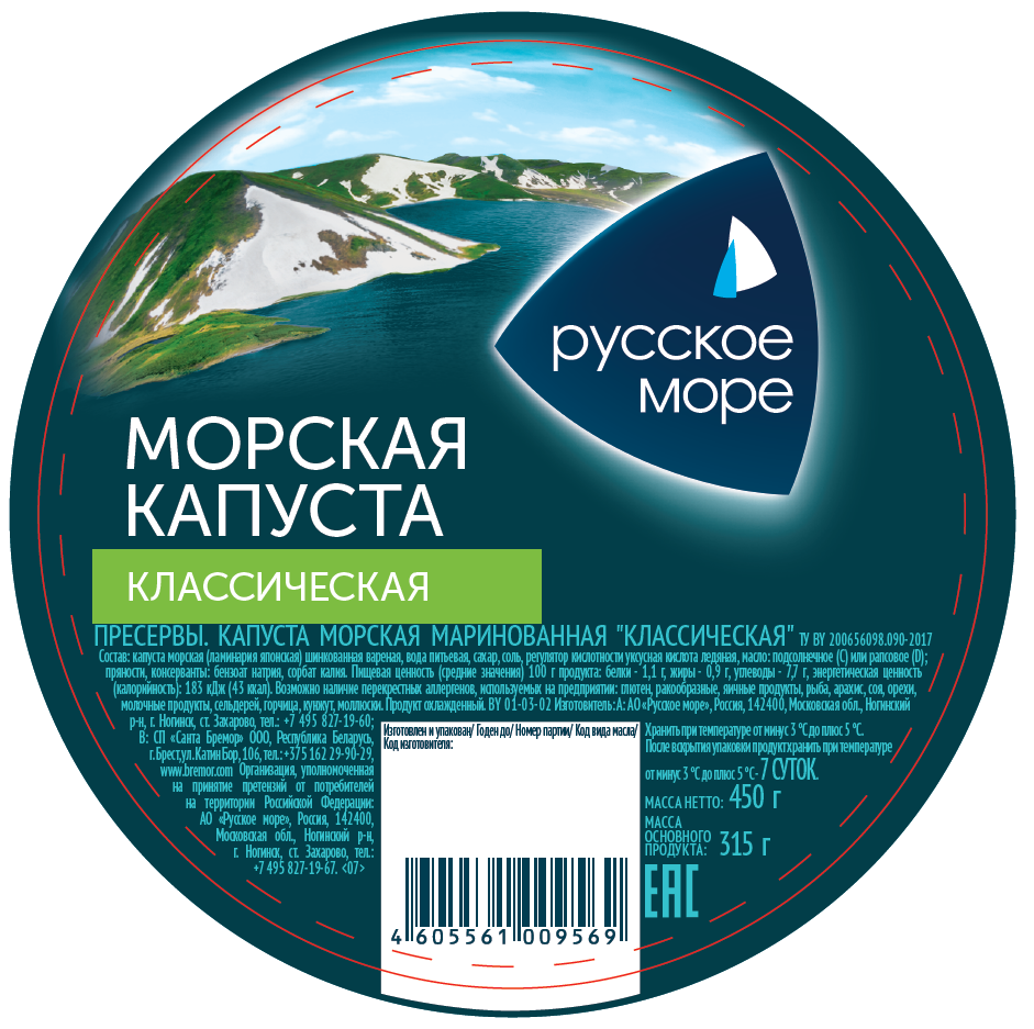 Капуста морская (ламинария японская) шинкованная вареная, вода питьевая, сахар, соль, регулятор кислотности уксусная кислота ледяная, масло: подсолнечное (С) или рапсовое (D), пряности, консерванты: бензоат натрия, сорбат калия, подсластитель сахарин.