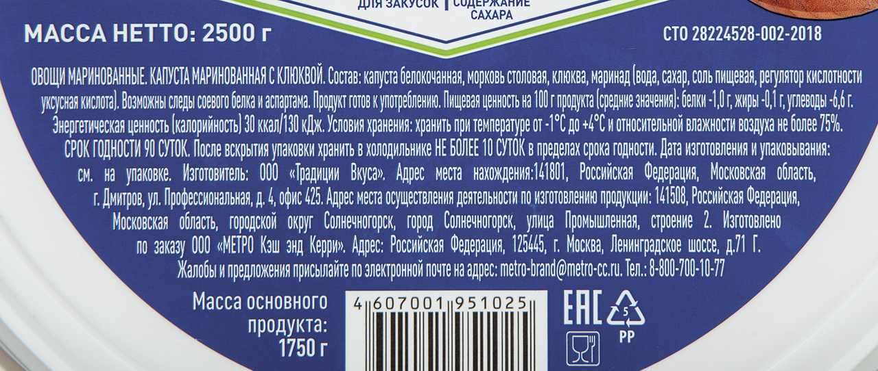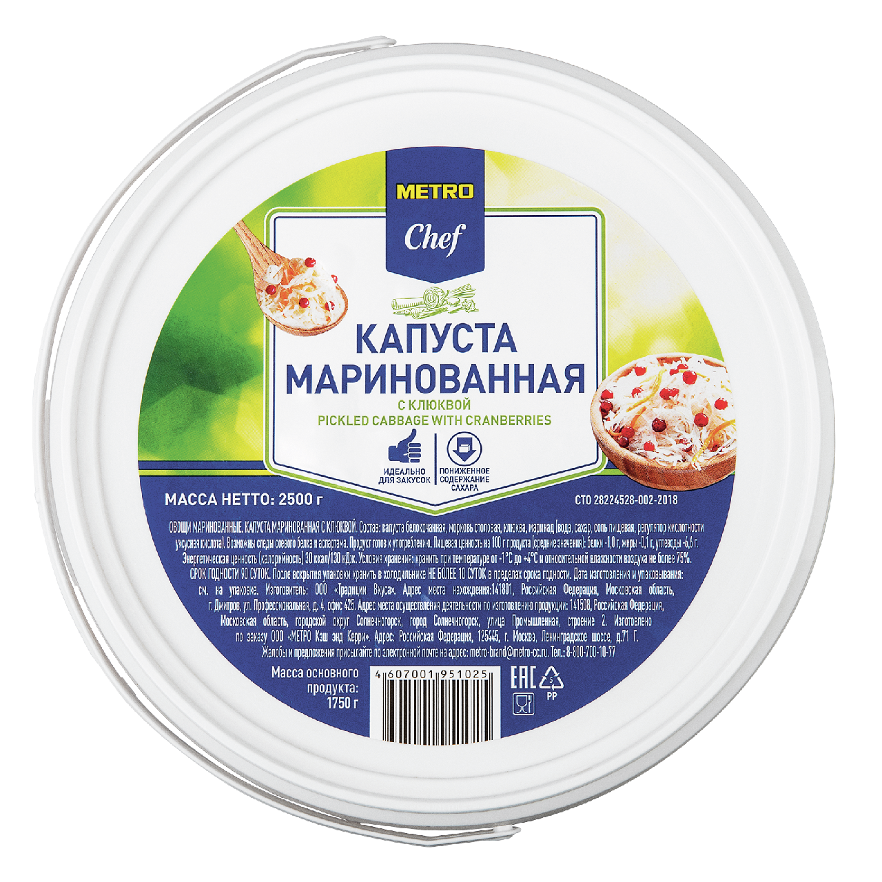 Капуста с клюквой METRO Chef, 2,5 кг – это самостоятельное блюдо или ингредиент для добавления в пищу многих известных европейских и азиатских кухонь. В частности, в большом количестве ее используют в русской, украинской, болгарской, средиземноморской, корейской, китайской и других кухнях. Маринованную капусту добавляют в первые и вторые блюда, делают с ней салаты и закуски. За счет высокого содержания витамина С, особенно в сочетании с тем, который содержится в клюкве, продукт становится незаменимым для тех, кто часто болеет простудными заболеваниями или страдает пониженным иммунитетом. Капуста отлично стимулирует перистальтику ЖКТ, незаменима при гастрите или пониженной кислотности, рекомендована в качестве вспомогательной терапии при интоксикации организма. METRO Chef – это популярный бренд, который принадлежит торговой сети Метро. В ассортимент входят такие категории товаров, как молочные продукты, мясная гастрономия, соусы и приправы, замороженные фрукты и ягоды, рыба и морепродукты и многое другое. Выпуская продукцию под собственными торговыми марками METRO, мы стремимся максимально удовлетворить потребности наших клиентов. Наша цель – понять, какой ассортимент для них актуален и предложить его по привлекательной цене. Мы также внимательно изучаем тенденции рынка, чтобы быть в курсе последних трендов и своевременно предлагать решения под собственными торговыми марками в соответствии с ними.