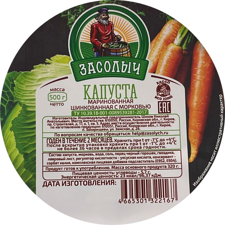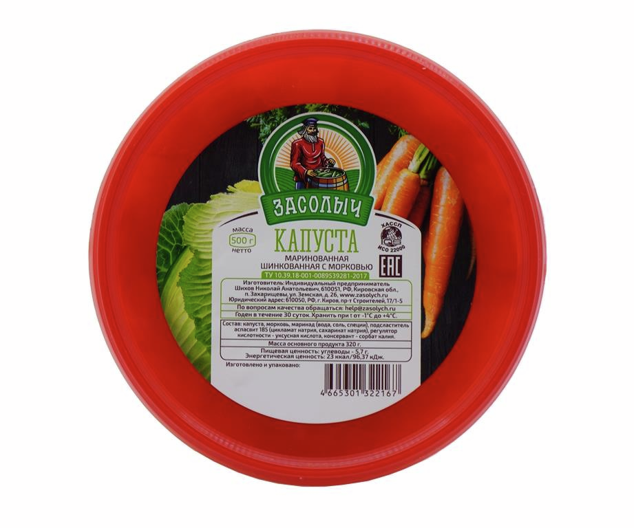 Капуста ТМ Засолыч маринованная шинкованная с морковью, 500 г – продукт, приготовленный по старинным рецептам. Маринованная капуста используется для приготовления винегрета, пшенника, ее можно есть заправленной маслом и луком, в составе разных салатов. Это продукт, обладающий массой полезных свойств для организма человека. Регулярное применение значительно улучшает пищеварение, работу сердца и сосудов, предотвращает развитие онкологии. В составе капусты присутствуют пищевые волокна, жиры, растительные белки, углеводы. Кроме того, в достаточных для организма человека количествах содержатся кальций, калий, магний, фосфор, натрий, цинк и витамин С. Название торговой марки Засолыч возникло от слова солить. Дедушка на картинке - символ истории, традиций, как раньше. В ассортименте торговой марки – более 50 наименований продукции, которые представлены как в локальных, так и в федеральных сетях. В своем производстве ТМ Засолыч использует сырье местного производители, не импортное, не заморское. Почти все сырье для продукции Засолыча выращивается на вятской земле, в экологически чистом Истобенском районе. Засолыч из года в год является участником и официальным партнером межрегионального фестиваля Истобенский огурец. На фестивале можно не только продегустировать продукцию, но и принять участие в мастер-классе по засолке в настоящих деревянных бочках.