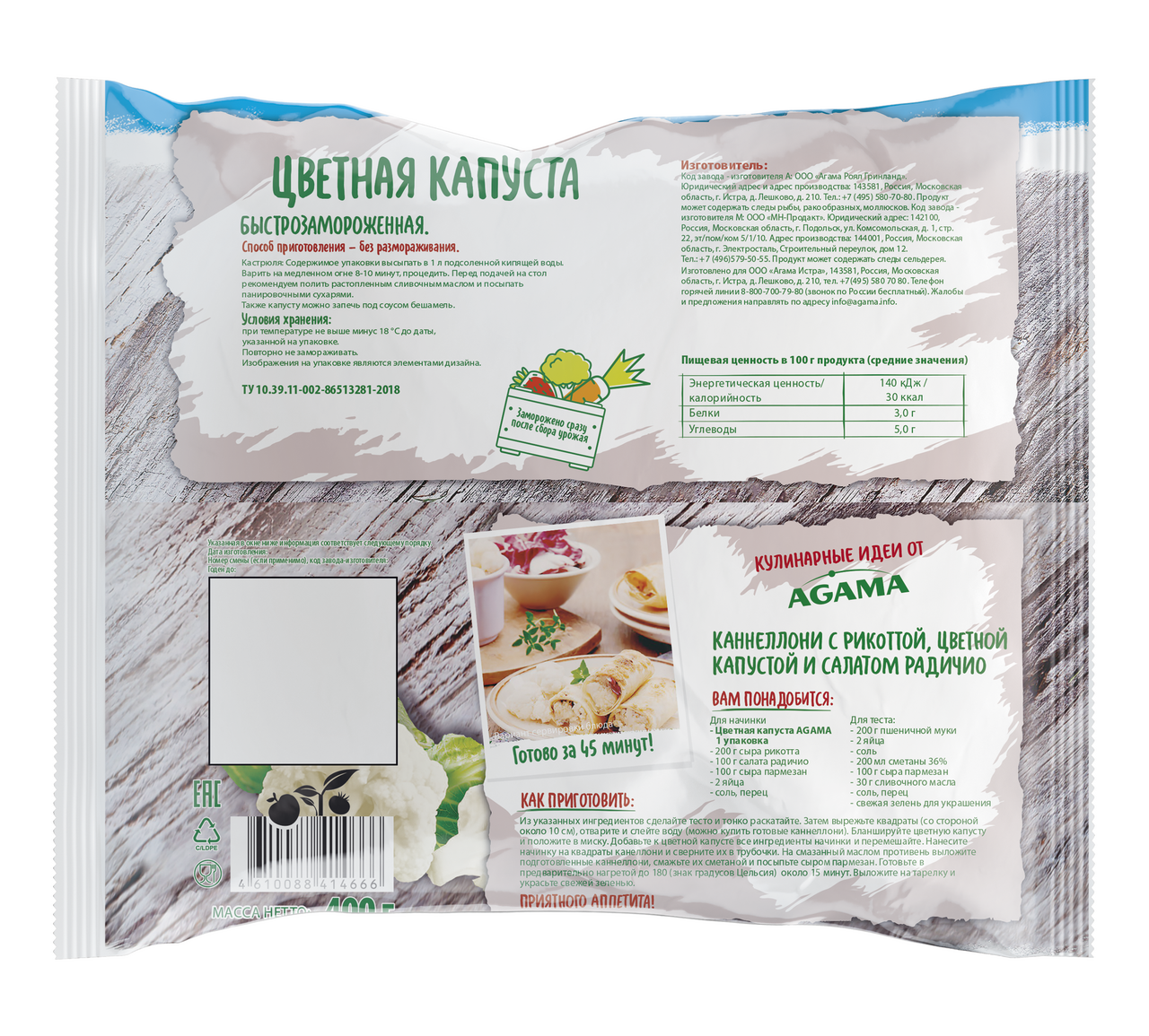 Цветная капуста Agama, 400г – экологически чистый продукт, который поможет облегчить приготовление вкусных блюд и сэкономить ваше время. Овощи Hortex выращивают на собственной производственной базе, оснащенной современным европейским оборудованием для обработки сырья. Высокие вкусовые качества делают цветную капусту отличным гарниром или частью овощных салатов. Передовая технология заморозки позволяет сохранять свежесть и полезные свойства продукта.