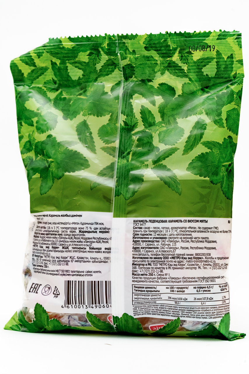 Cостав короба: 10шт. Леденцовая карамель с вкусом мяты. Освежающий нежный вкус. Не содержит ГМО Состав: Сахар-песок, патока, ароматизатор "Мята" Условия хранения: При температуре от +15С до +21С и относительной влажности воздуха не выше 75% Срок хранения: 12 месяцев