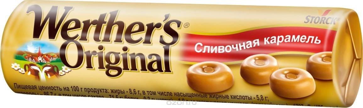 Карамель Werther's Original сливочная 50г.Состав: сахар, глюкозный сироп, сливки пастеризованные (7,4 %), сыворотка молочная сгущенная подсырная, масло сливочное (4,8 %), сироп изтростникового сахара, соль поваренная пищевая, эмульгатор соевыйлецитин (Е322), ароматизатор ванилин.Пищевая ценность на 100 г продукта: жиры - 8,6 г, в том числе насыщенные жирные кислоты - 5,8г; углеводы – 86,7г, в том числе сахара – 71,5г; белки – 0,3г; натрий – 1,0г.Энергетическая ценность (калорийность) – 1797 кДж/425 ккал.Хранить в сухом прохладном месте.Срок годности 12 месяцев.