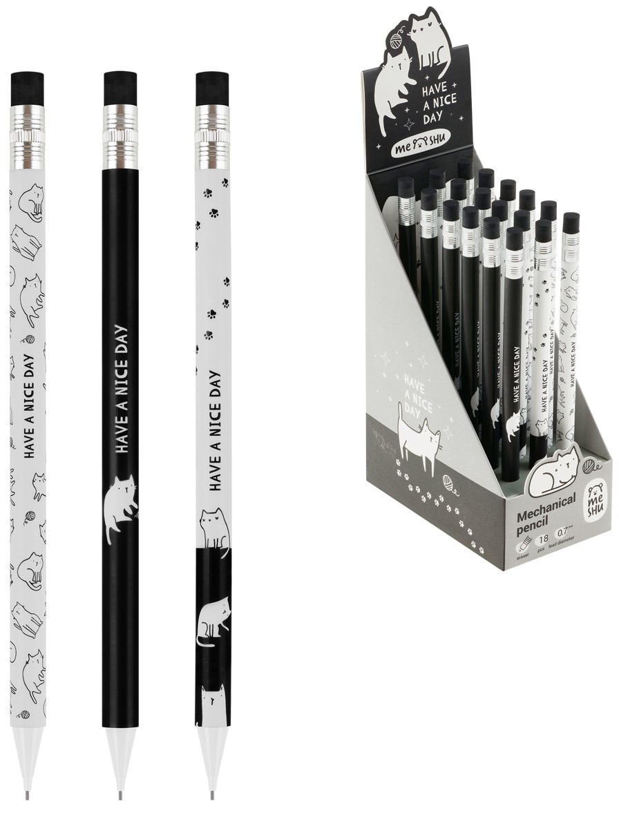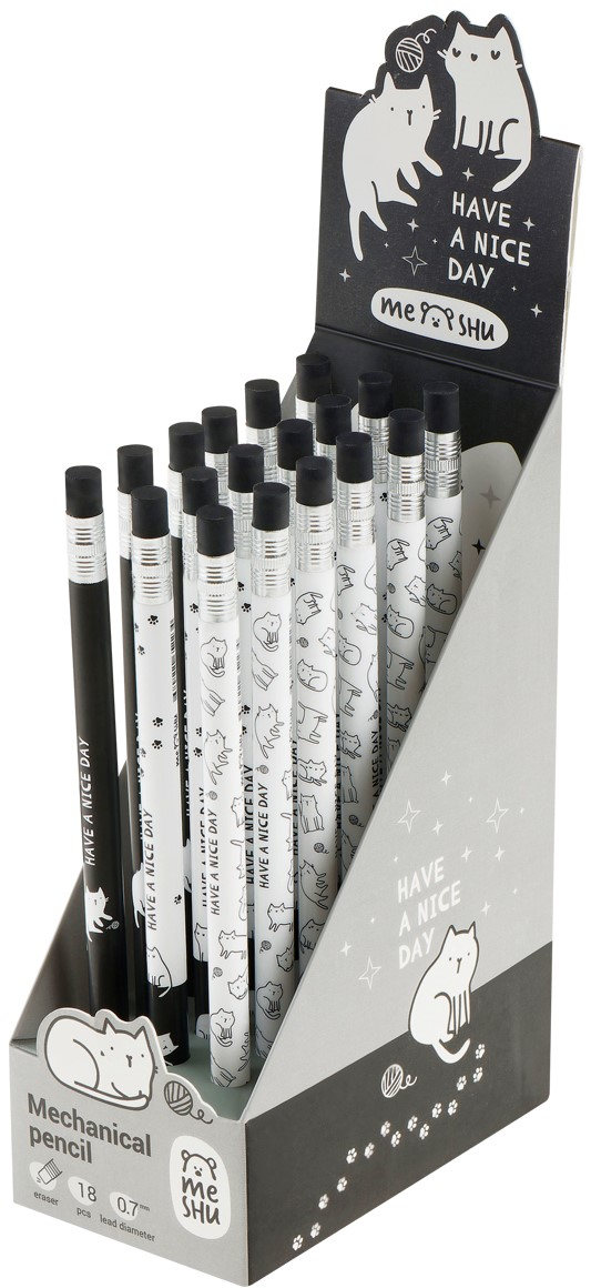 Механические карандаши с печатью на корпусе и ластиком Meshu станут отличными помощниками в школе или офисе. Круглый корпус выполнен в стильных, ярких дизайнах, рисунки нанесены высококачественной термотрансферной печатью. Диаметр грифеля - 0,7мм, твердость - HB, материал корпуса - пластик. Карандаши упакованы в картонный дисплей-бокс по 18 штук. Подача грифеля осуществляется с помощью кнопочного механизма.