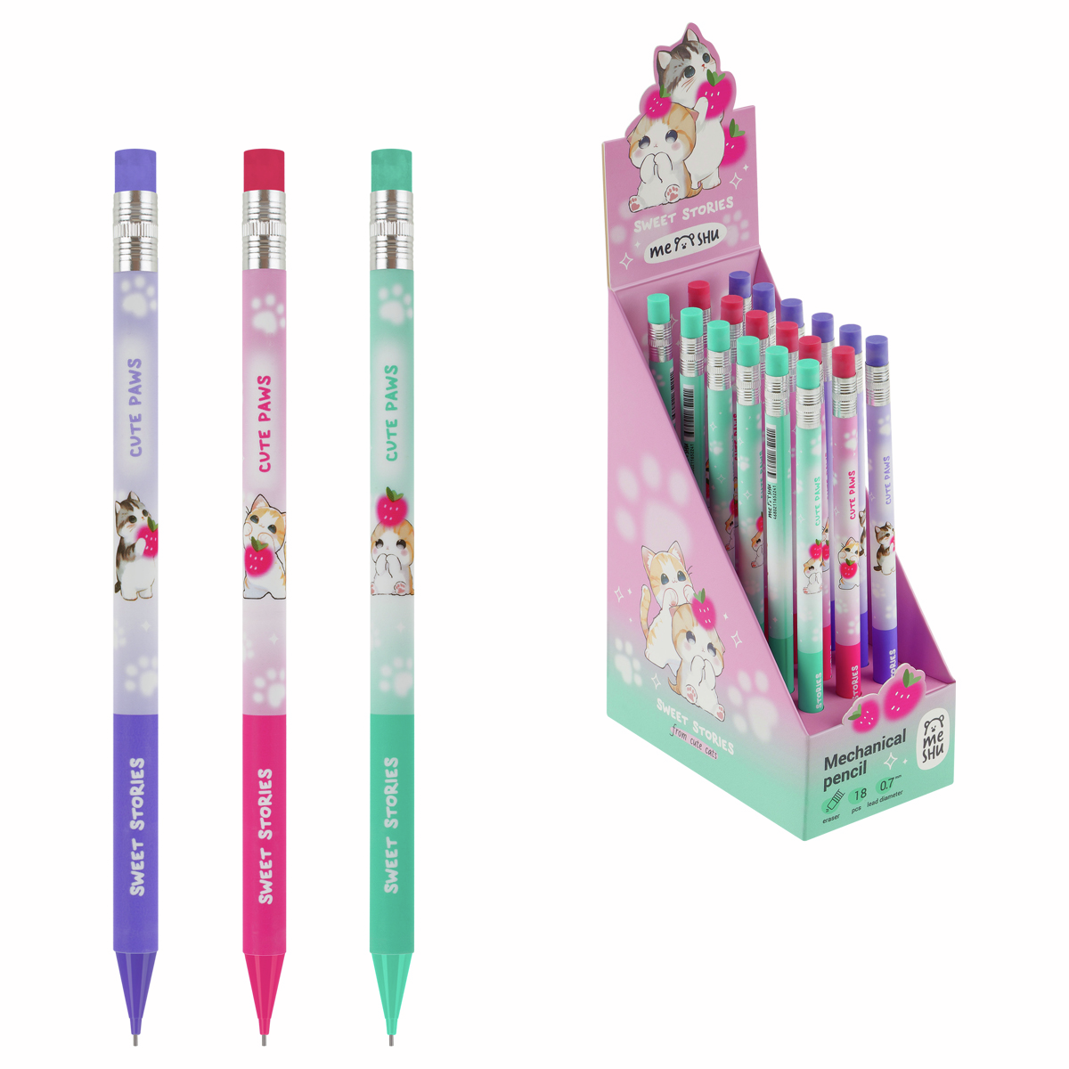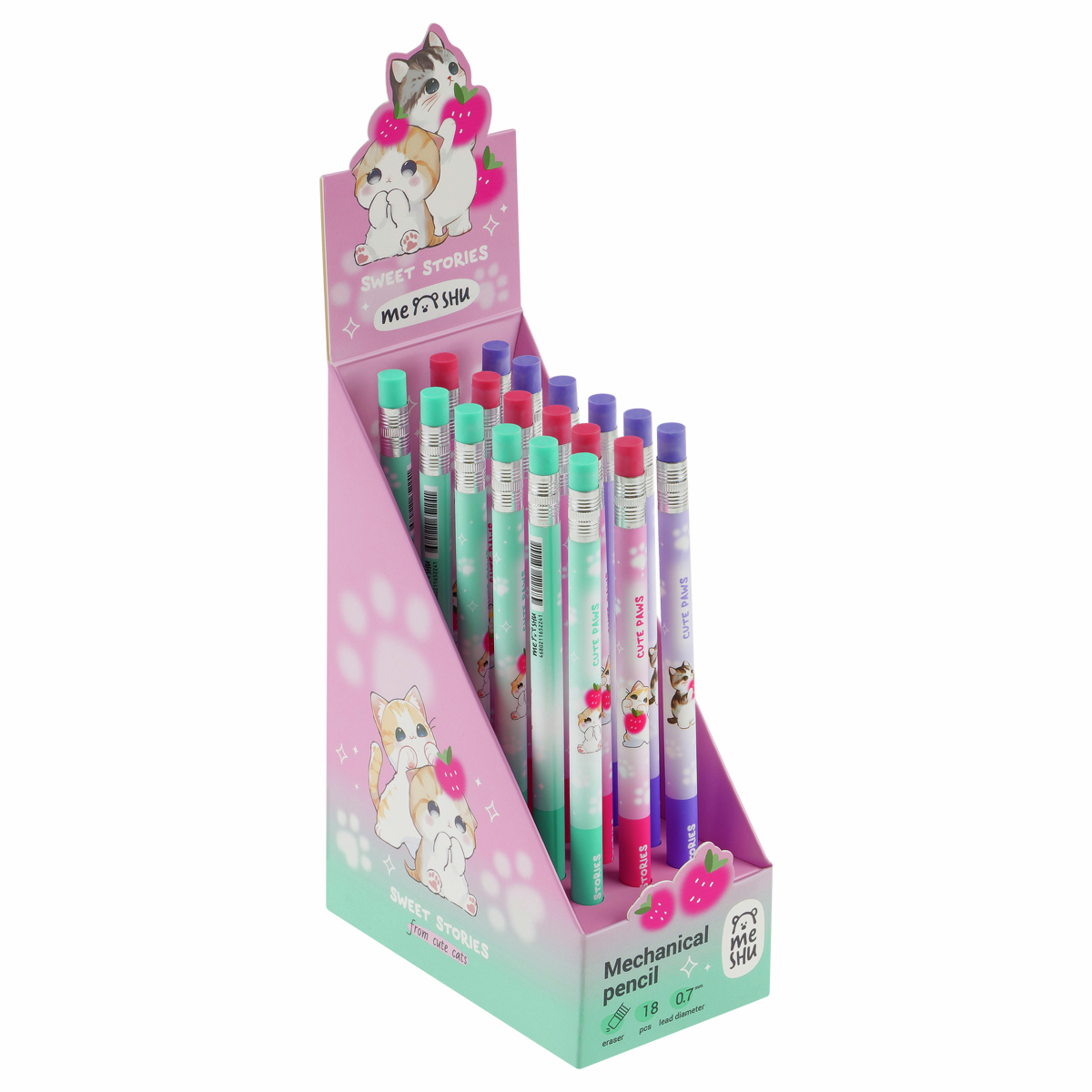 Механические карандаши с печатью на корпусе и ластиком Meshu станут отличными помощниками в школе или офисе. Круглый корпус выполнен в стильных, ярких дизайнах, рисунки нанесены высококачественной термотрансферной печатью. Диаметр грифеля - 0,7мм, твердость - HB, материал корпуса - пластик. Карандаши упакованы в картонный дисплей-бокс по 18 штук. Подача грифеля осуществляется с помощью кнопочного механизма.