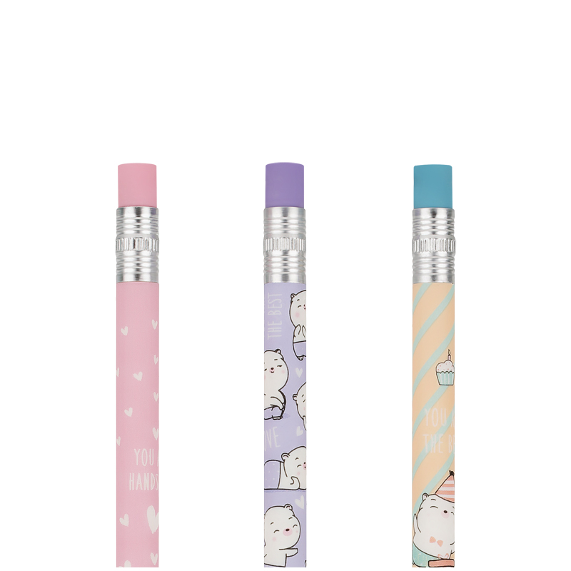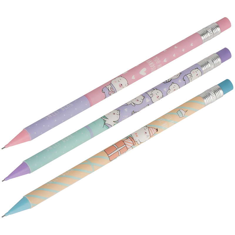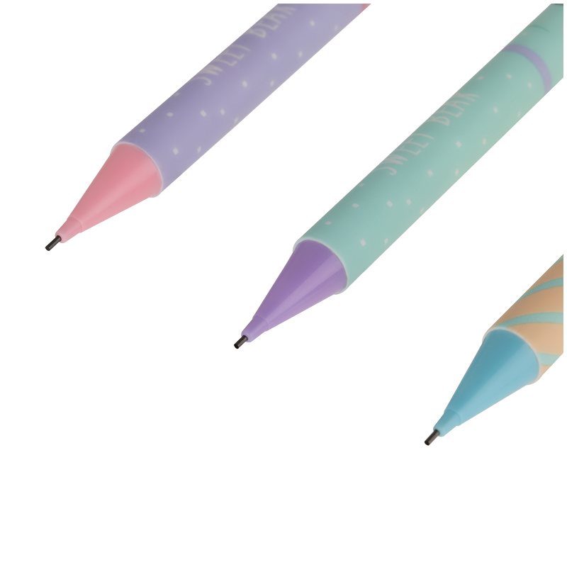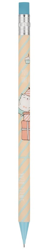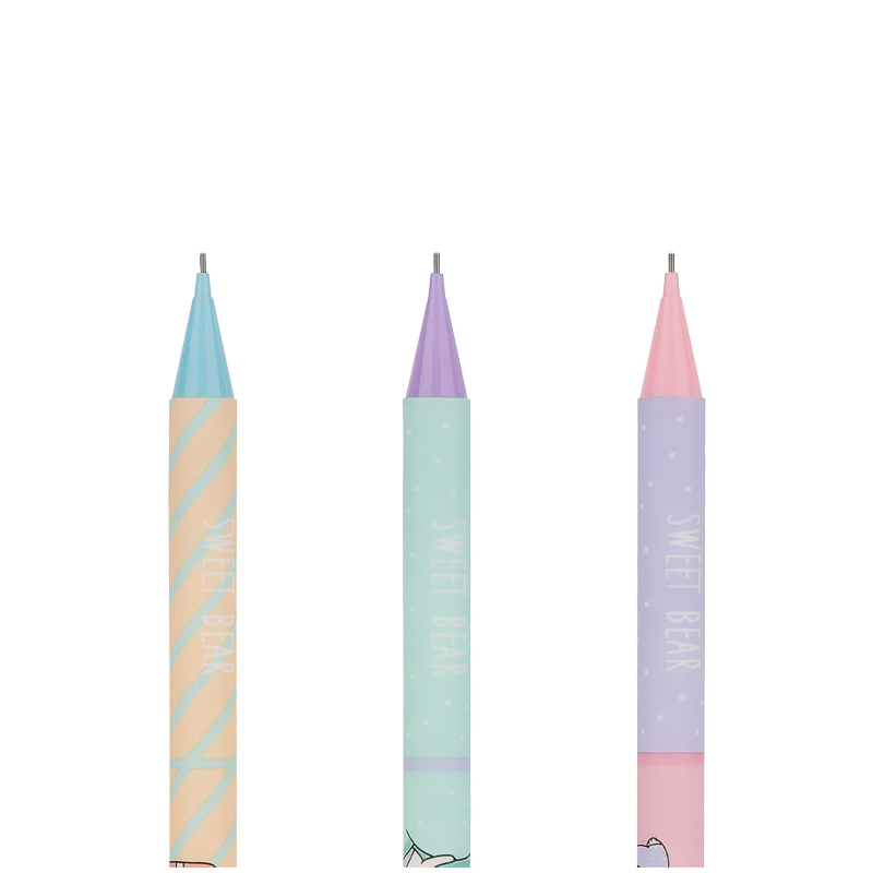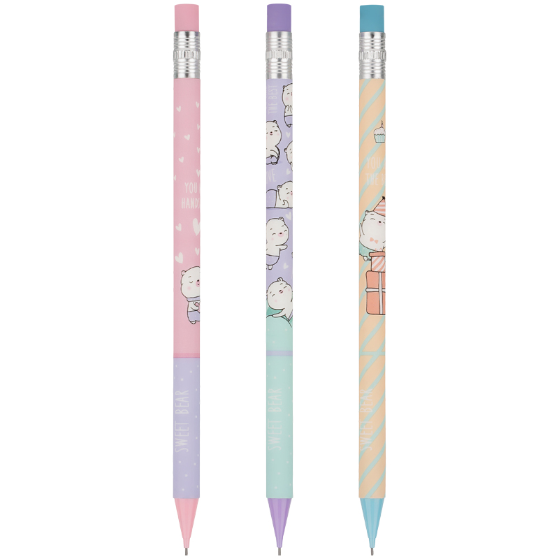 Карандаш Meshu Sweet Bear механический с ластиком - круглый корпус выполнен в стильных, ярких дизайнах, рисунки нанесены высококачественной термотрансферной печатью. Диаметр грифеля 0,7мм, твердость HB, материал корпуса - пластик, подача грифеля осуществляется с помощью кнопочного механизма.