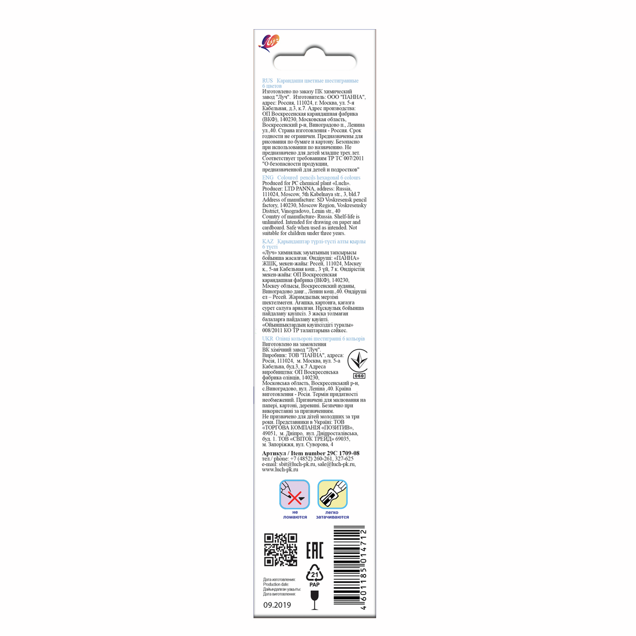 Карандаши цветные, заточенные, для рисования на бумаге, изготовлены из качественной древесины, ударопрочные и легко затачиваются, не оставляя заусенцев. Форма карандаша шестигранная, она делает карандаш устойчивым на поверхности. Длина корпуса карандаша 177 мм. Диаметр грифеля 3 мм. Поставляются в картонной упаковке с европодвесом, размер 45?8x217 мм.