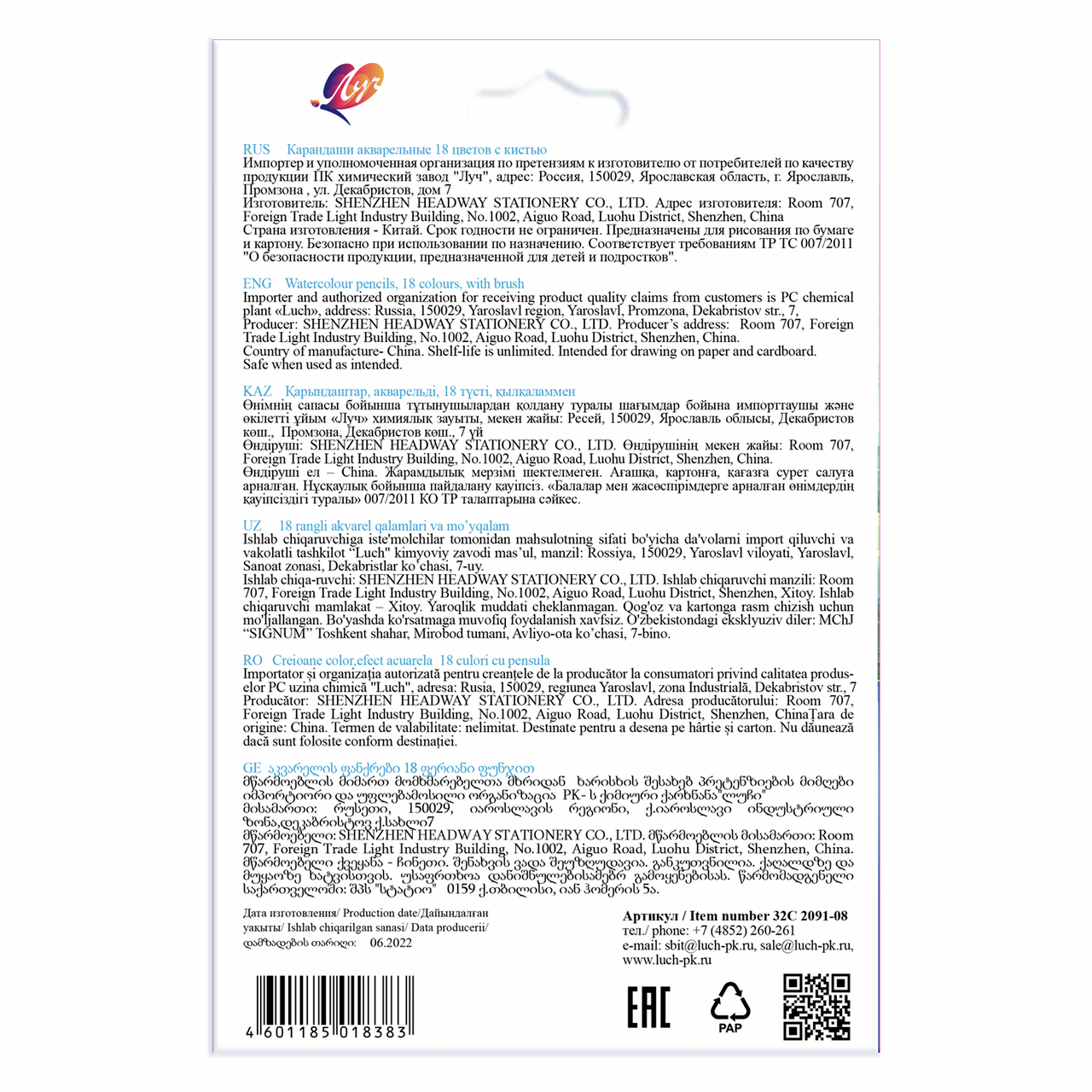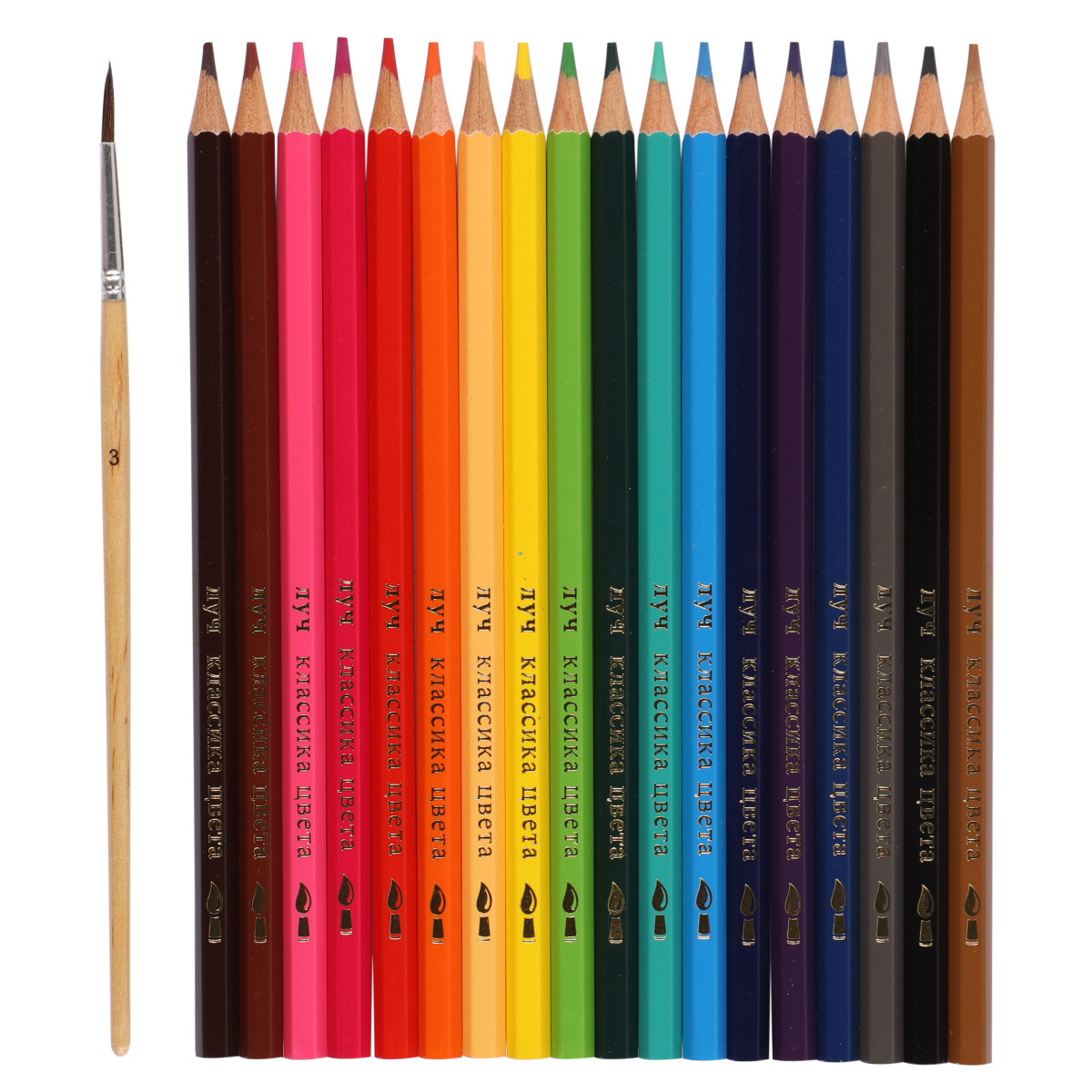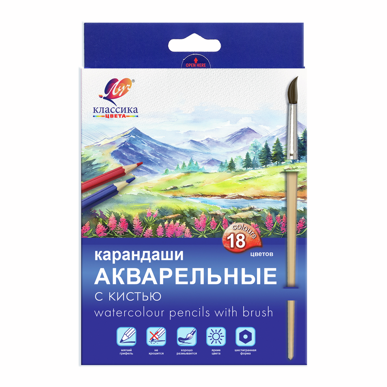 Карандаши акварельные Луч с кистью, 18 цветов предназначены для творчества всех возрастных категорий пользователей.Выполнены из качественной древесины, имеютшестигранное сечение, за счет чего не скатываются с поверхности стола. Компоненты грифеля позволяют мягко наносить рисунок на бумагу и отлично размывать его кистью. Упаковка красочная картонная коробка с подвесом. Легко открывается с помощью язычка.