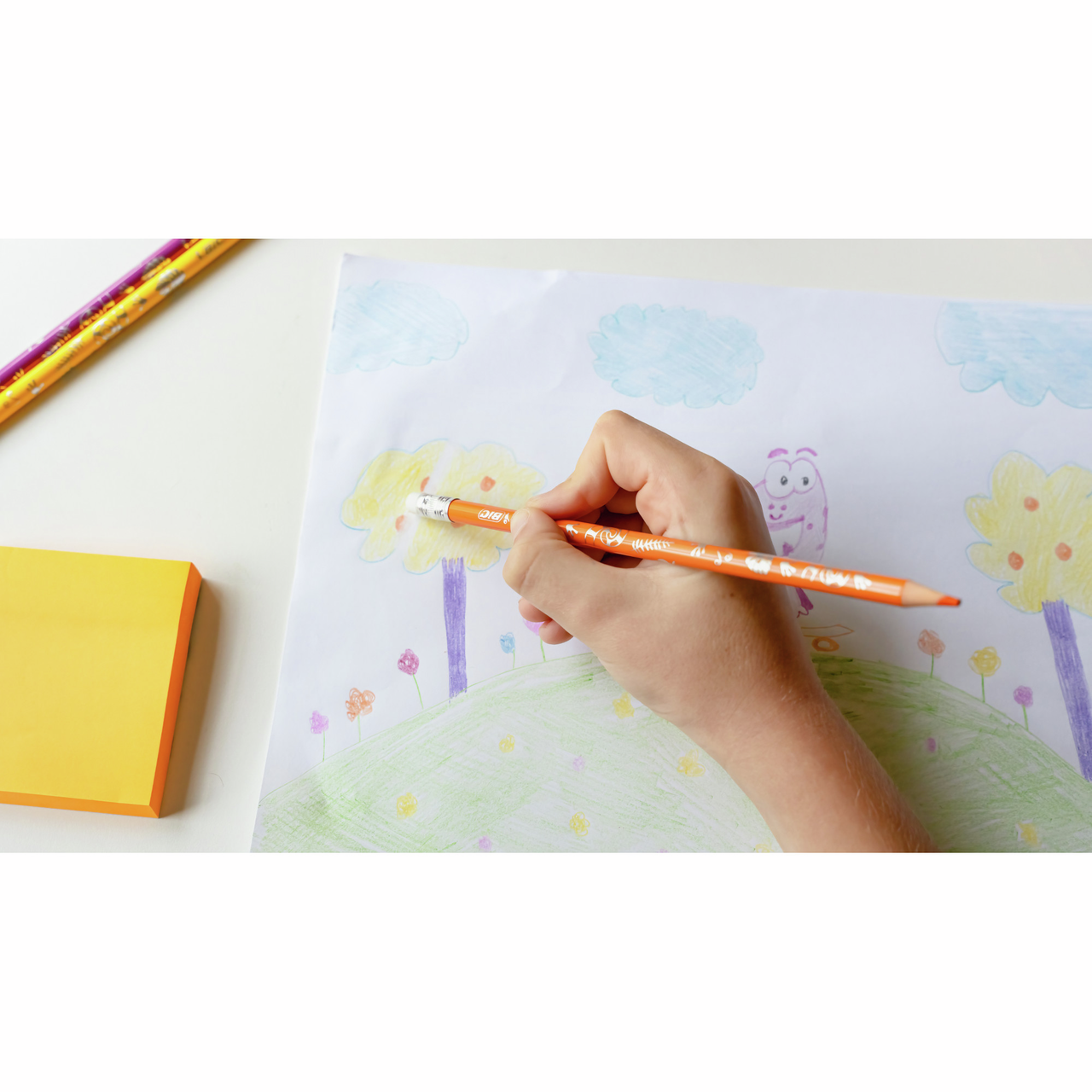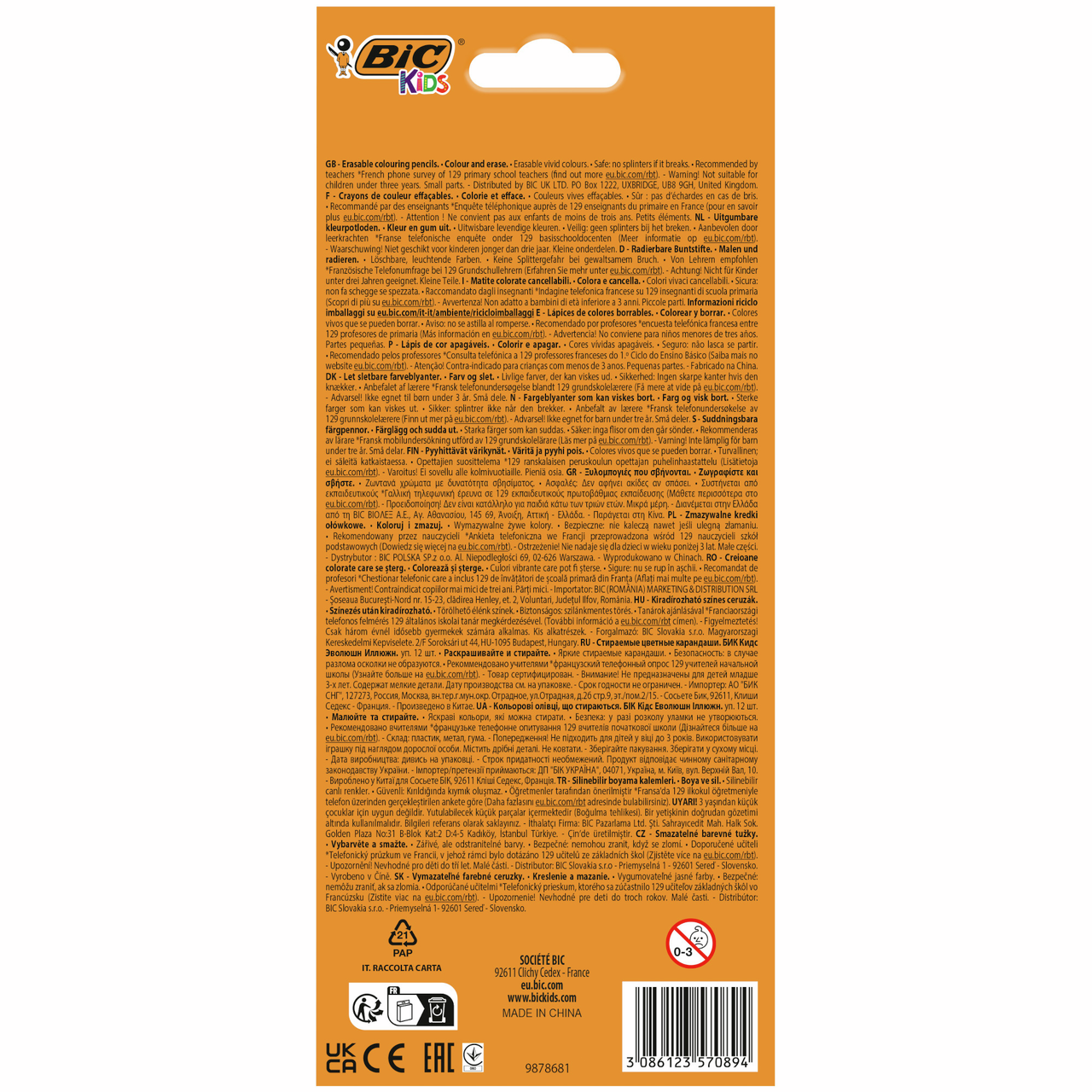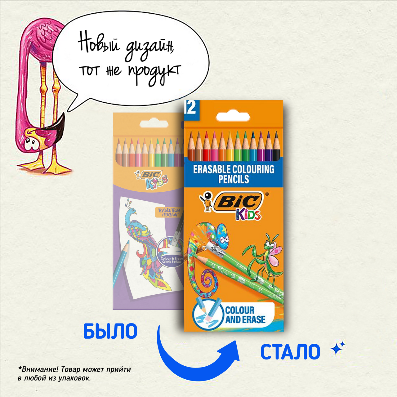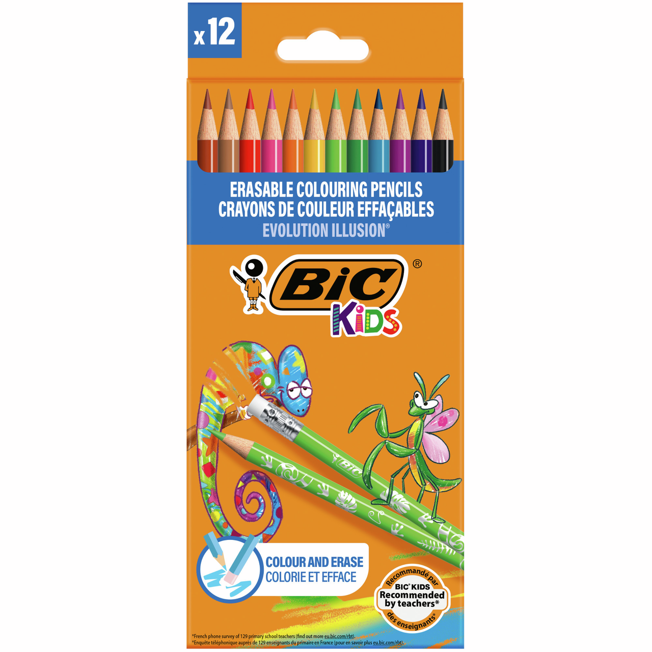 Хотите узнать, в чём суперсила цветных карандашей BIC Kids Evolution Illusion? Они стираются быстрее и легче, чем когда бы то ни было! И больше нет необходимости искать ластик - он к вашим услугам прямо на кончике карандаша. Такие карандаши станут приятной находкой для отличников, выполняющих школьные работы и создающих произведения искусства, требующие особой точности. Благодаря инновационной разработке BIC вам больше не нужно бояться допустить ошибку! В поисках такого бескомпромиссного качества мы провели целый ряд тестов над набором BIC Kids Evolution Illusion. Эти цветные карандаши для детей представлены в 12 насыщенных оттенках, благодаря которым легко достичь потрясающих творческих результатов. Сверхпрочный грифель диаметром 2.8 мм поможет создать картинки с множеством ярких деталей или раскрасить большие фигуры. Легко найти необходимый карандаш с помощью округлого корпуса, выполненного в цвет грифеля. Карандаши упакованы в картонную коробку для удобства хранения. И в путешествие, и в школу - их можно взять с собой куда угодно, а после использования быстро собрать и компактно хранить в одном месте. На вашем столе всегда будет порядок, чтобы вы могли работать без помех. Карандаши для рисования BIC Kids Evolution Illusion - ещё одно подтверждение экспертизы BIC, которая делает вашу жизнь немного проще. Для детей от 5 лет.
