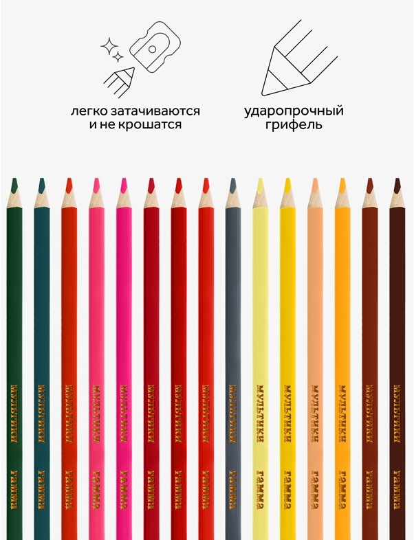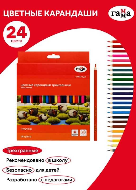 Цветные карандаши Гамма серии Мультики выполнены в эргономичном трехгранном корпусе, который подскажет ребенку, как правильно держать инструмент во время творческих занятий. В наборе 24 цвета.