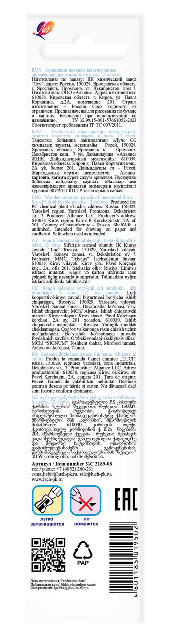 Карандаши цветные Луч Классика двусторонние 12 цветов, 6 штук