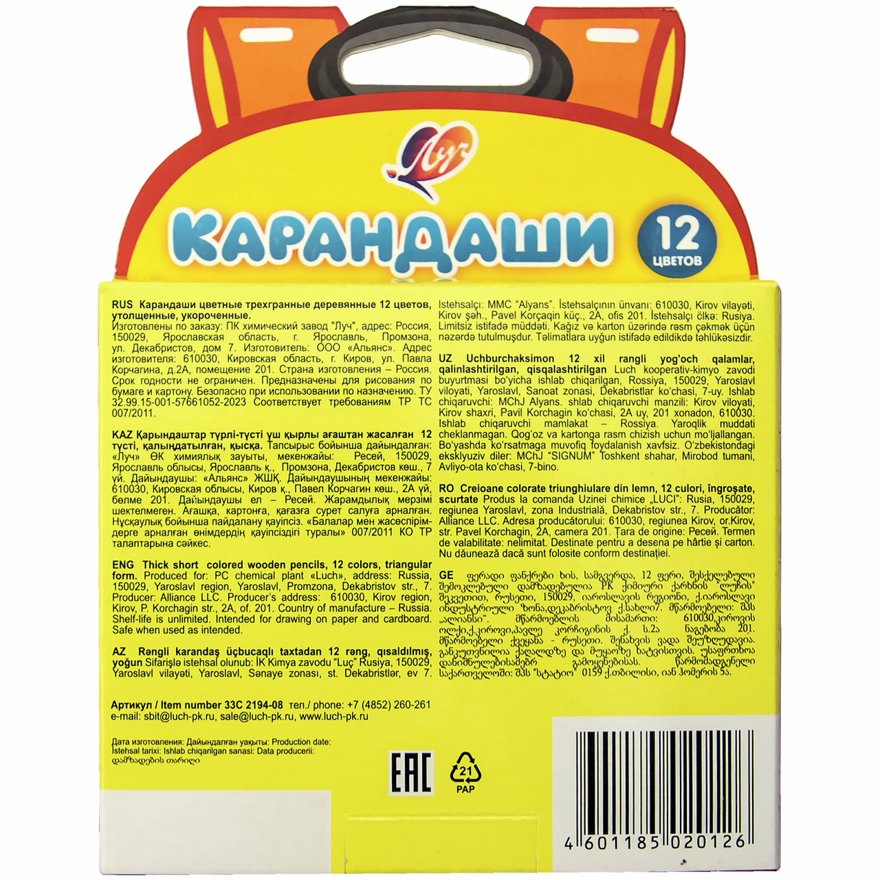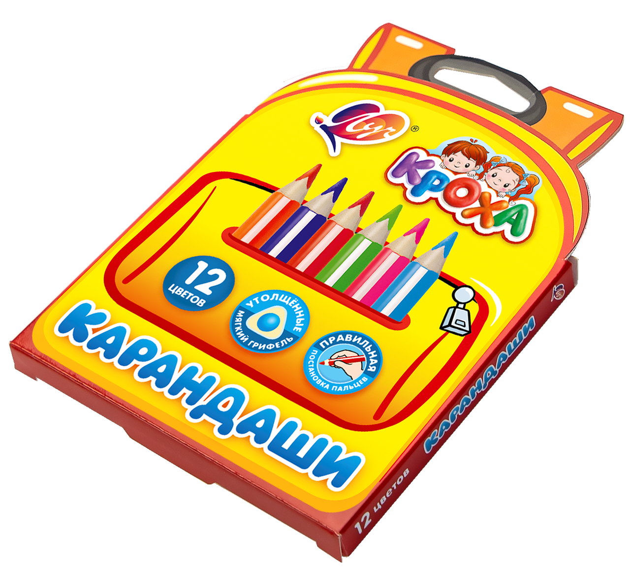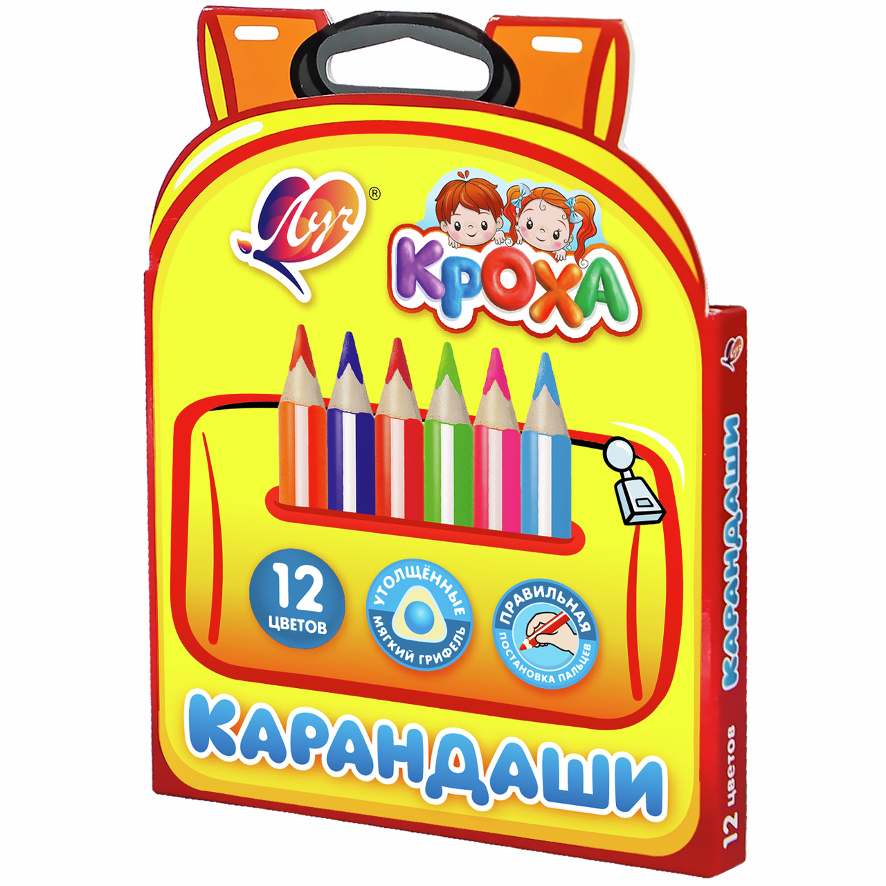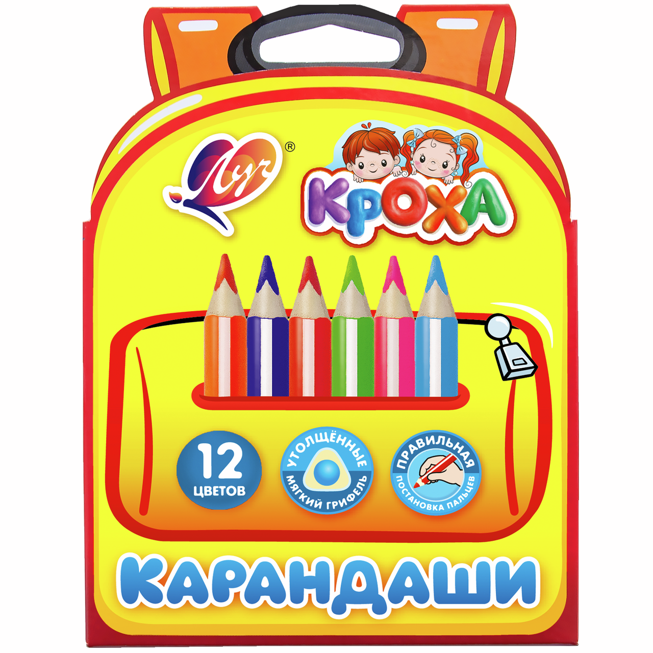 Карандаши цветные Кроха, утолщенные, укороченные, 12цв. (А). Идеальный инструмент для творчества и обучения маленьких художников. Разработаны специально для детей и имеют множество преимуществ. В наборе карандашей 12 ярких цветов. Трёхгранная форма и утолщённый корпус карандаша помогает ребёнку правильно удерживать его, снижая мышечное напряжение. Изготовлены из качественной древесины. Мягкий грифель диаметром 5 мм идеально подходит для мягкого и ровного нанесения цветов на бумагу. Длина карандашей составляет 88мм, что делает их удобными для детей любого возраста. Яркая удобная коробочка в виде рюкзачка сразу привлекает внимание ребёнка. Клапан упаковки оснащён удобным язычком: коробку легко открывать и закрывать. В наборе 12 цветов: Черный, Коричневый, Красный, Желтый, Салатовый, Синий, Оранжевый, Персиковый, Зеленый, Голубой, Фиолетовый, Розовый.