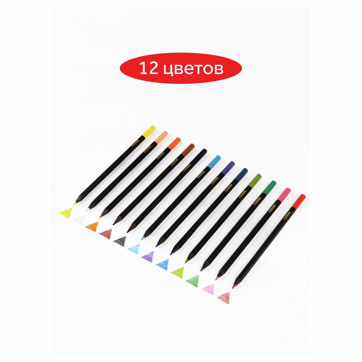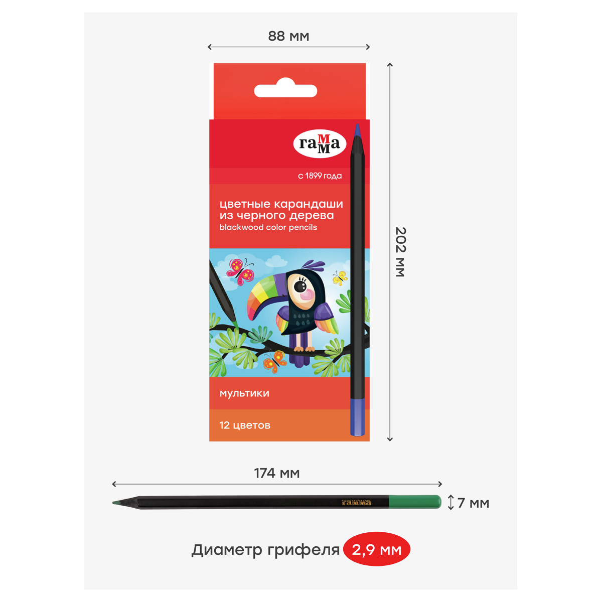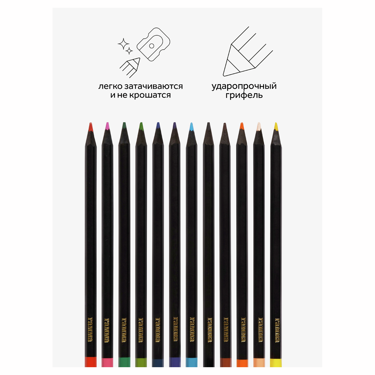 Выполнены в стильном шестигранном корпусе из высококачественной древесины черного цвета. В наборе 12 цветов: желтый, оранжевый, коричневый, телесный, черный, голубой, фиолетовый, синий, салатовый, зеленый, розовый, красный. Диаметр грифеля — 2,9 мм. Проклеенный ударопрочный грифель не крошится во время заточки и не ломается даже после падения. Корпус карандаша диаметром 7 мм и длиной 174 мм изготовлен из дерева. Специальная обработка древесины позволяет легко заточить карандаш без зазубрин и заноз. За яркость и высокую укрывистость отвечают качественные пигменты в составе. Ребенку не придется сильно давить на карандаш — рисунок получится ярким и равномерно закрашенным. Упаковка – картонная коробка с европодвесом.
