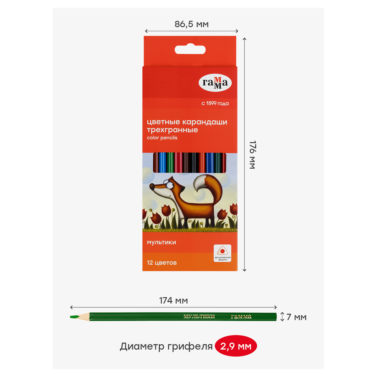 Выполнены в эргономичном трёхгранном корпусе, который подскажет ребенку, как правильно держать карандаш во время творческих занятий. В наборе 12 цветов: жёлтый, оранжевый, розовый, красный, салатовый, зеленый, голубой, синий, фиолетовый, бежевый, коричневый, черный. Диаметр грифеля – 2,9 мм. Проклеенный ударопрочный грифель не крошится во время заточки и не ломается даже после падения. Корпус карандаша длиной 174 мм изготовлен из дерева. Специальная обработка древесины позволяет легко заточить карандаш без зазубрин и заноз. За яркость и высокую укрывистость отвечают качественные пигменты в составе. Ребенку не придется сильно давить на карандаш – рисунок получится ярким и равномерно закрашенным.