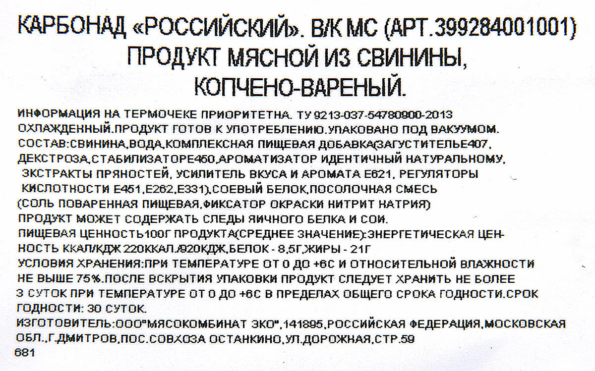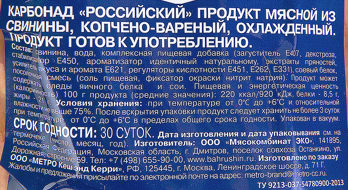 Свинина, вода, комплексная пищевая добавка (загуститель Е 407, декстроза, стабилизатор Е450, ароматизатор идентичный натуральному, экстракты пряностей, усилитель вкуса и аромата Е621, регуляторы кислотности Е451, Е262, Е331), соевый белок, посолочная смесь (соль поваренная пищевая, фиксатор окраски нитрит натрия).