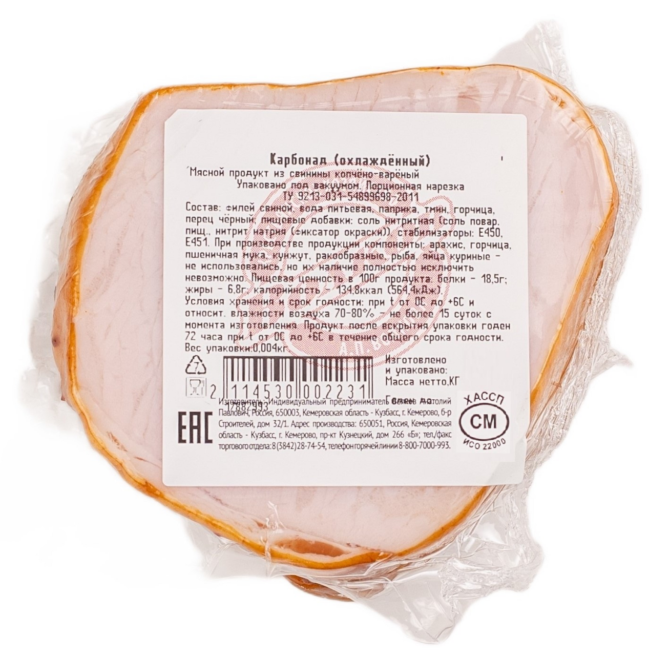 Филей свиной, вода питьевая, паприка, тмин, горчица, перец чёрный, пищевые добавки: соль нитритная соль поваренная пищевая, нитрит натрия фиксатор окраски, стабилизаторы: Е450, Е451.