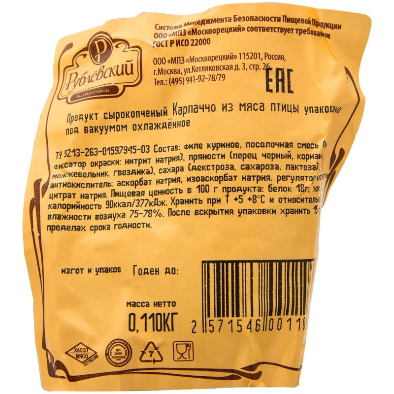 Карпаччо Рублевский из мяса птицы - это отечественный деликатес высшего сорта с изящным сочным вкусом и ароматом, пробуждающим аппетит. В основе продукта сырокопченое куриное филе, приготовленное в холодном дыму буковой щепы. Низкая для мясного продукта калорийность позволяет не волноваться о вреде для фигуры и сочетать товар даже с довольно строгим диетическим меню. Деликатес можно употреблять как в оригинальном виде, так и готовить с ним салаты (карпаччо легко режется), подавать с другими блюдами или в составе различных кулинарных изысков.