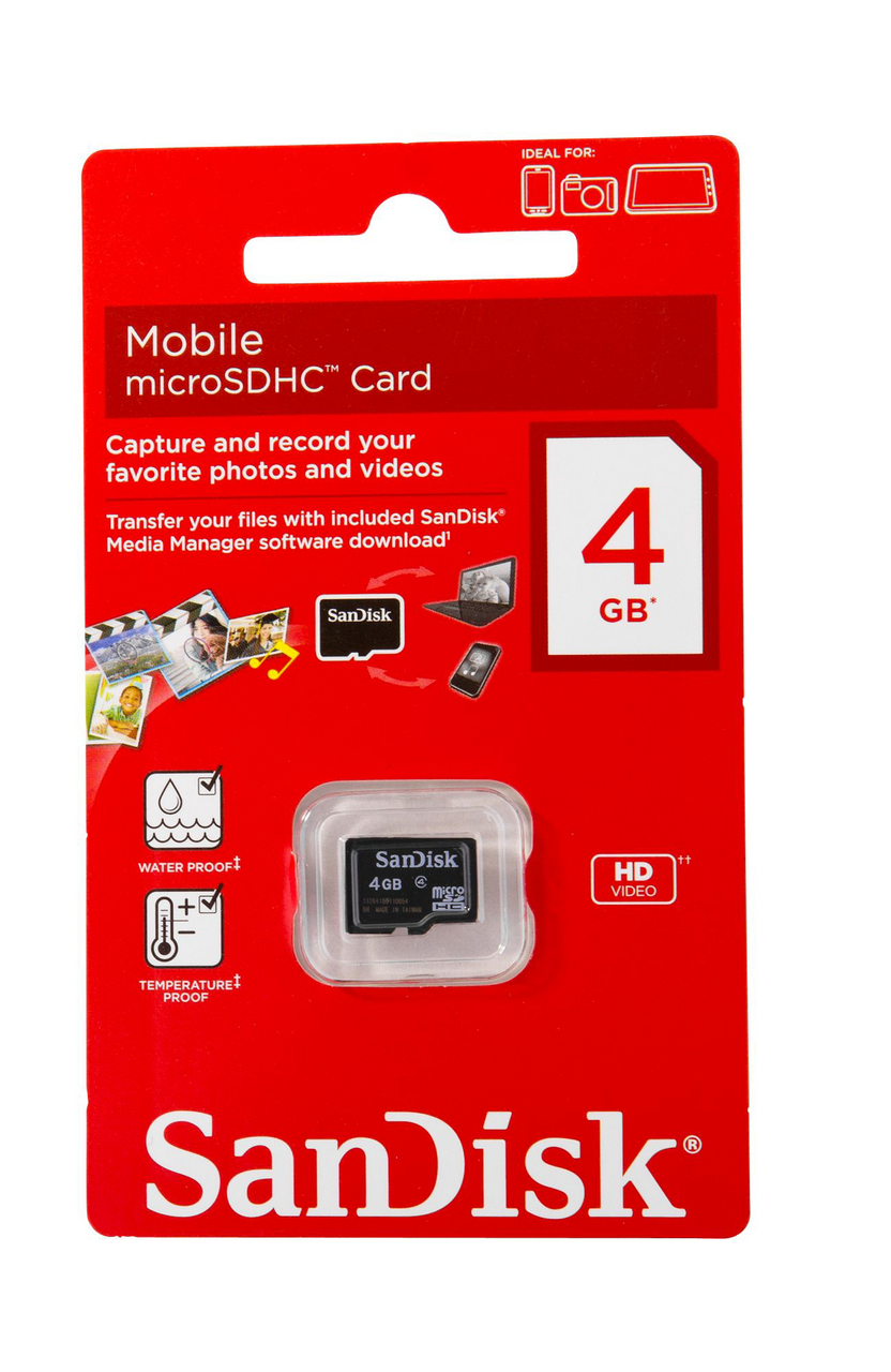 Карта памяти Sandisk Micro SD, 4 Гб. Высокоскоростная карта формата microSDHC без адаптера. Устройство для расширения внутренней памяти мобильных устройств. Ударопрочная, устойчивая к ударам и вибрации: выдерживает ударные нагрузки до 500 г, защищенная от рентгеновских лучей - невосприимчива к рентгеновским сканерам в аэропорту, термостойкая: работает при температурах от -13 до 185 ?F (от -25 до 85 ?C) и водостойкая.