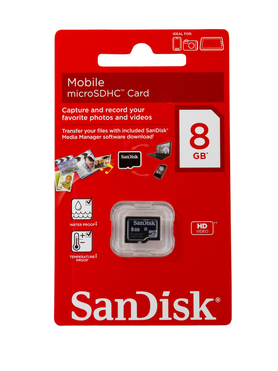 Карта памяти SanDisk Micro SD, 8 Гб. Высокоскоростная карта формата microSDHC без адаптера. Устройство для расширения внутренней памяти мобильных устройств. Ударопрочная, устойчивая к ударам и вибрации: выдерживает ударные нагрузки до 500 г, защищенная от рентгеновских лучей - невосприимчива к рентгеновским сканерам в аэропорту, термостойкая: работает при температурах от -13 до 185 ?F (от -25 до 85 ?C) и водостойкая.