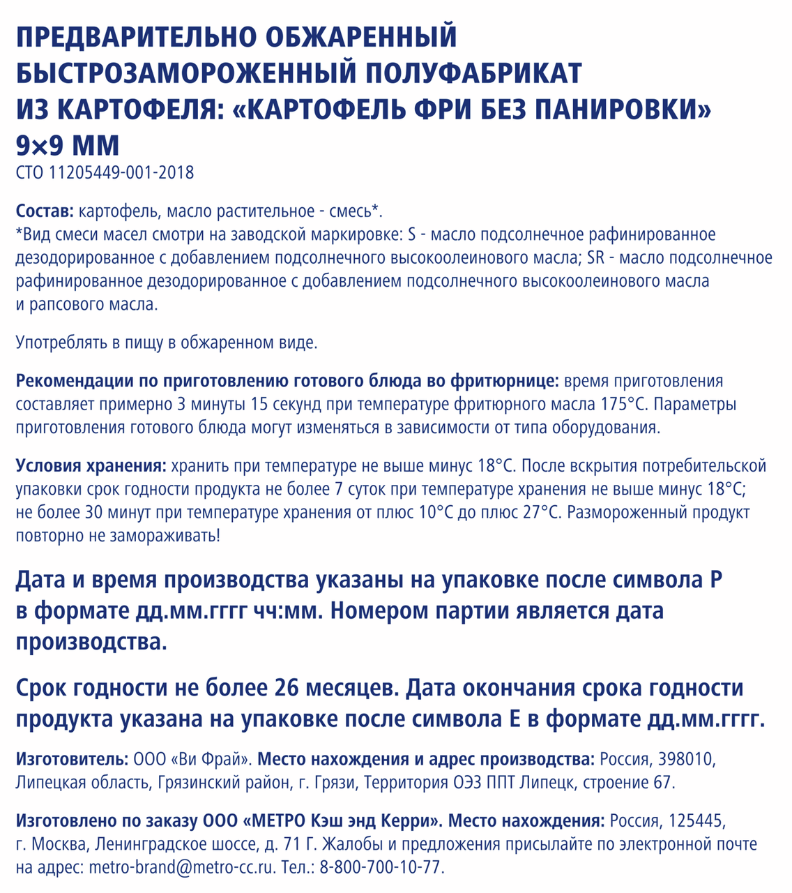 Рекомендации по приготовлению готового блюда во фритюрнице: время приготовления составляет примерно 3 минуты 15 секунд при температуре фритюрного масла 175 С. Параметры приготовления готового блюда могут изменяться в зависимости от типа оборудования.