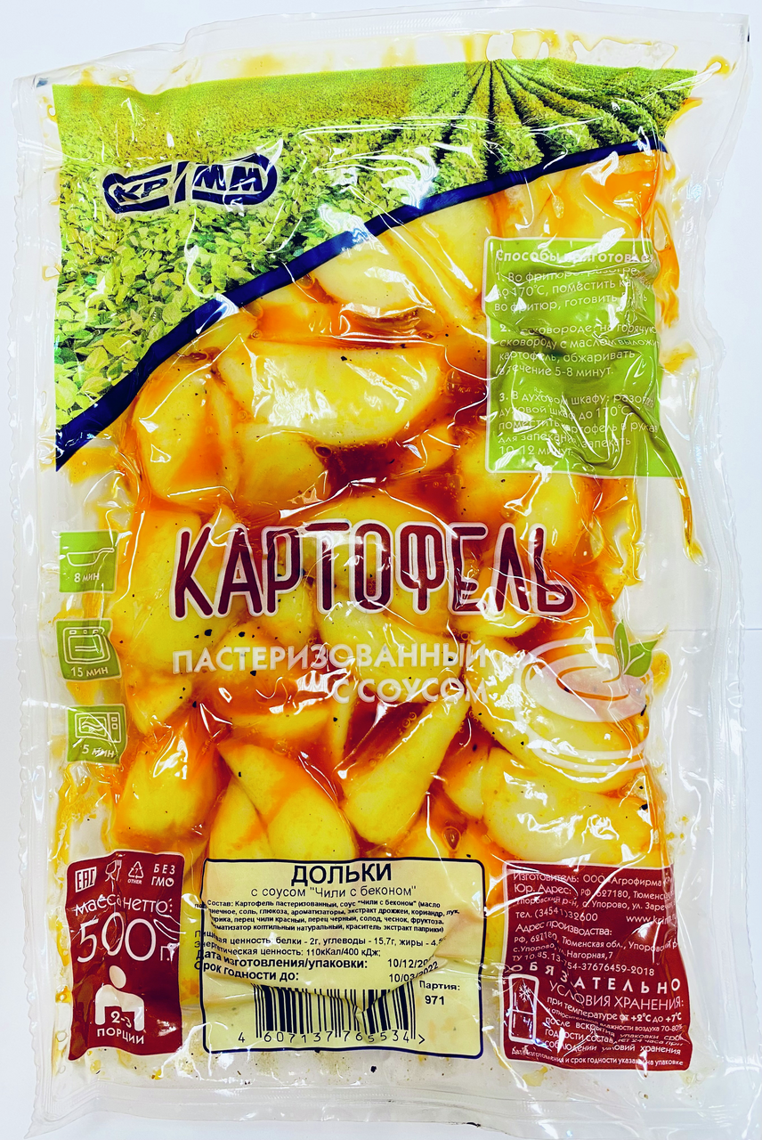 Картофель дольки Кримм с беконом с соусом Чили 500 г представляет собой аппетитный готовый продукт, который может выступать в качестве хорошего дополнения к блюдам из мяса, птицы или рыбы. Его можно подавать к обеденному или праздничному столу как гарнир или отдельно, дополнив различными соусами – сырным, чесночным, кисло-сладким, горчицей, кетчупом. В плотную упаковку помещен отборный картофель, нарезанный на небольшие ломтики и тщательно обжаренный. Насыщенный, оригинальный вкус овощу придает добавление небольшого количества сыра и бекона. Способ приготовления блюда очень простой. Для этого продукт достаточно лишь согреть в микроволновой печи в течение нескольких минут. Готовый картофель обладает нежным, ярким вкусом и приятным ароматом. Он быстро утоляет чувство голода, насыщает организм человека и восстанавливает запас сил. Употребление этого продукта является полезным для здоровья. В состав входят природные антиоксиданты, флавоноиды, различные витамины, калий, магний, фосфор и другие элементы. Картофель способствует нормализации пищеварения, улучшению мозговой деятельности и повышению иммунитета. Он выпускается в защитной упаковке небольшог�� размера. Объема содержимого может хватить на несколько порций. Кримм – это известная агрофирма, которая появилась в 1999 году в Тюменской области. Она занимается производством широкого ассортимента продукции, к которым относятся: зерновые культуры, свежие овощи, картофель и многое другое. К главным преимущества относятся: использование отборного сырья и уникальных решений.