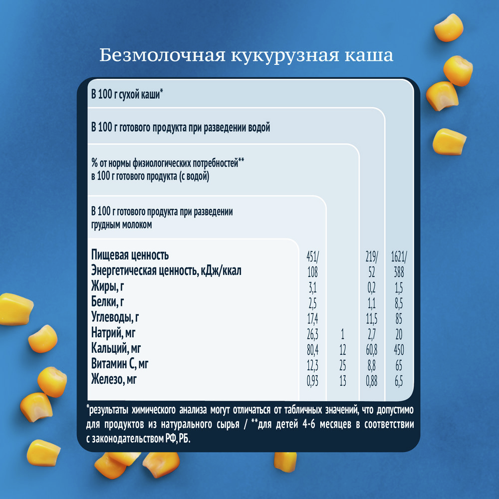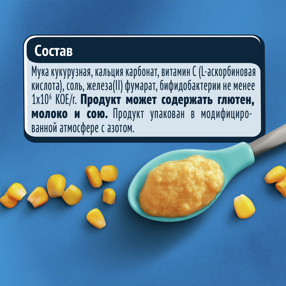 Мука кукурузная, кальция карбонат, витамин С (L-аскорбиновая кислота), соль, железа(II) фумарат, бифидобактерии не менее 1х106 КОЕ/г. Продукт может содержать глютен, молоко и сою. Продукт упакован в модифицированной атмосфере с азотом.