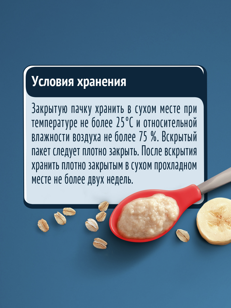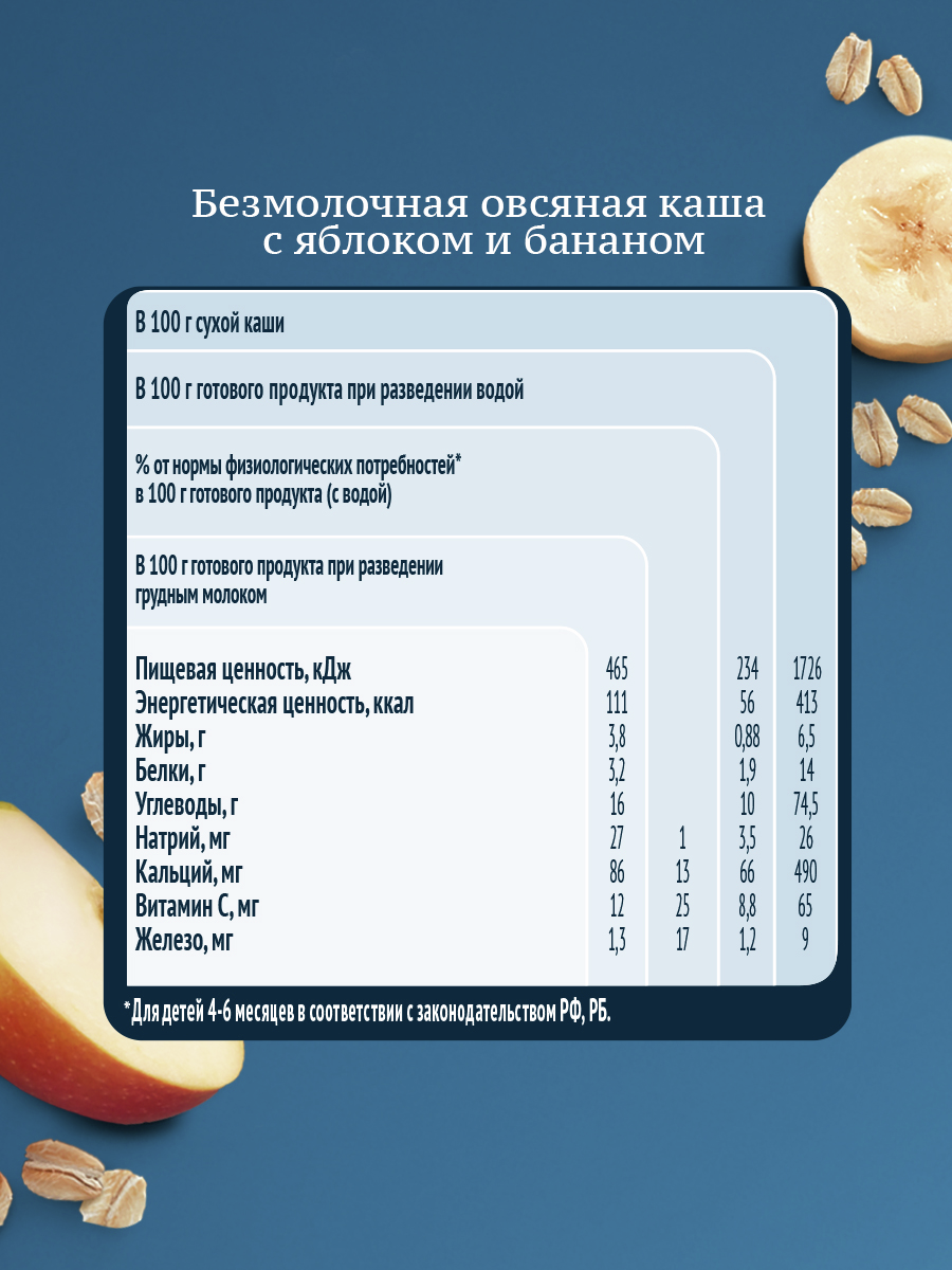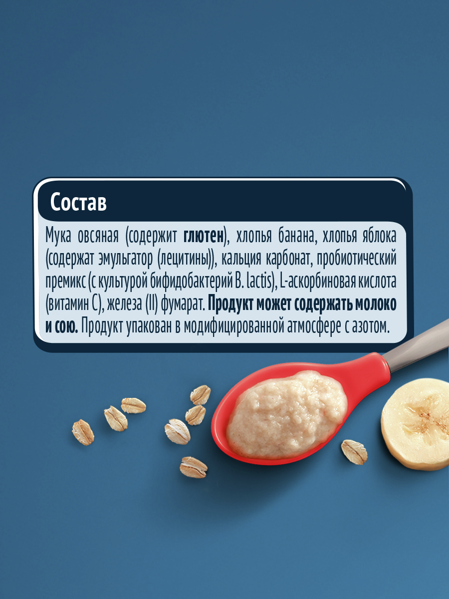 Мука овсяная содержит глютен, хлопья банана, хлопья яблока, кальция карбонат, соль, витамин С L-аскорбиновая кислота, железа II фумарат, бифидобактерии.