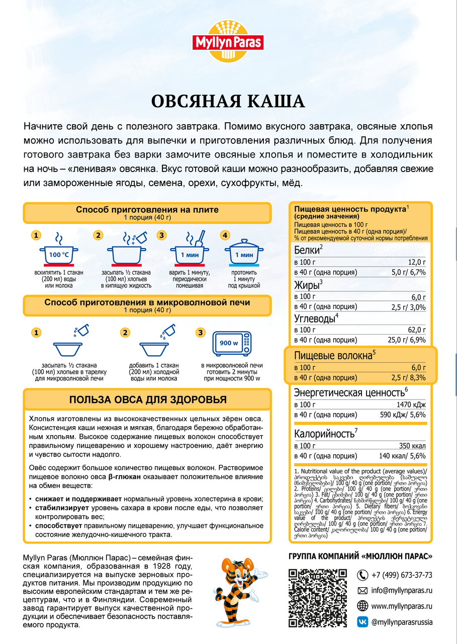 Каша Myllyn Paras Тигренок овсяная, 500г