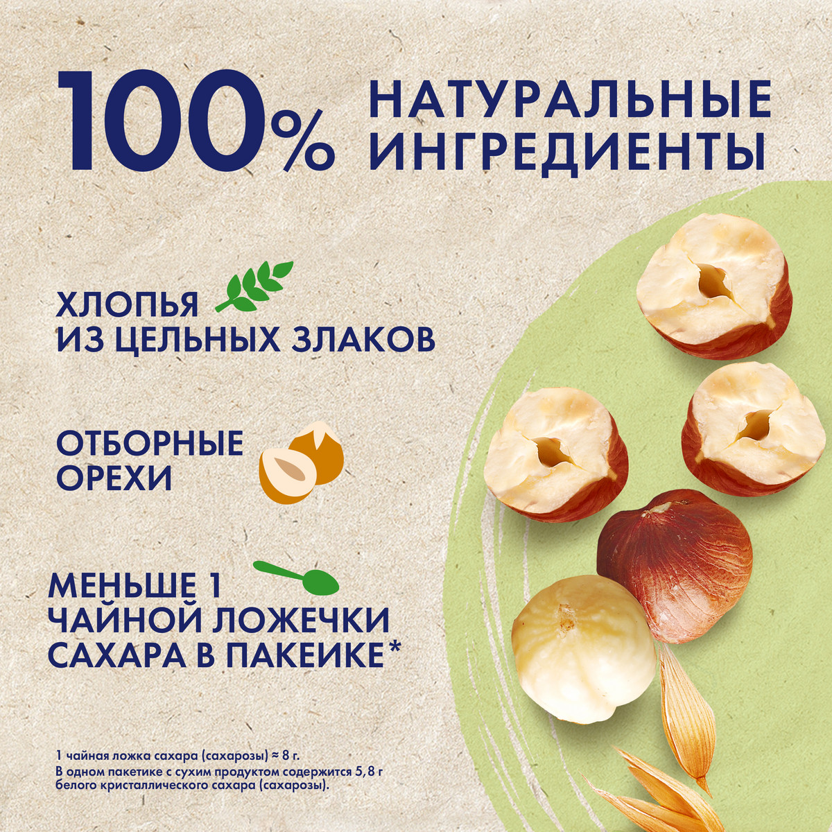 Хлопья из цельных злаков (73%) (овсяные, ржаные, пшеничные, ячменные (содержат глютен (клейковину)), хлопья гречневые), сахар, сыворотка молочная сухая, фундук (4%), обезжиренное сухое молоко, соль, медовый порошок (0,2%), натуральный ароматизатор.