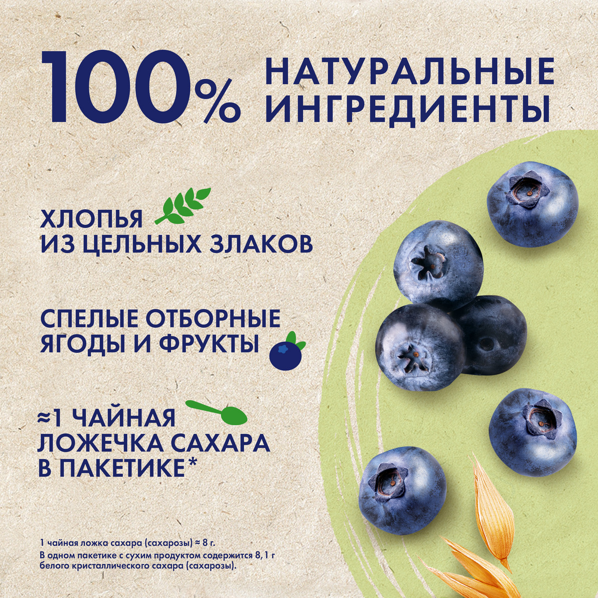 Хлопья овсяные из цельных злаков (76,6%) (содержат глютен (клейковину)), сахар, черника (2%), соль, натуральный ароматизатор.