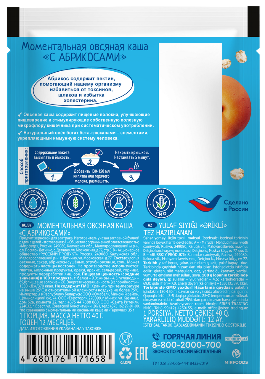 Моментальная овсяная каша содержит натуральные пищевые волокна. Абрикос содержит пектин. Натуральный овес богат бета-глюканами - веществами. Поможет быстро приготовить питательный, вкусный и полезный завтрак. Чтобы получить аппетитное блюдо, нужно лишь залить содержимое горячей жидкостью (водой или молоком), перемешать и дать постоять несколько минут.