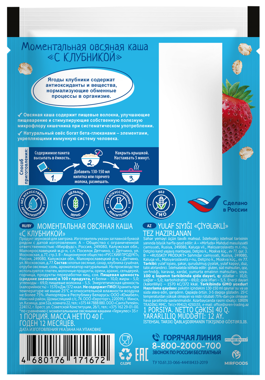 Каша овсяная Русский продукт геркулес клубника, 40г