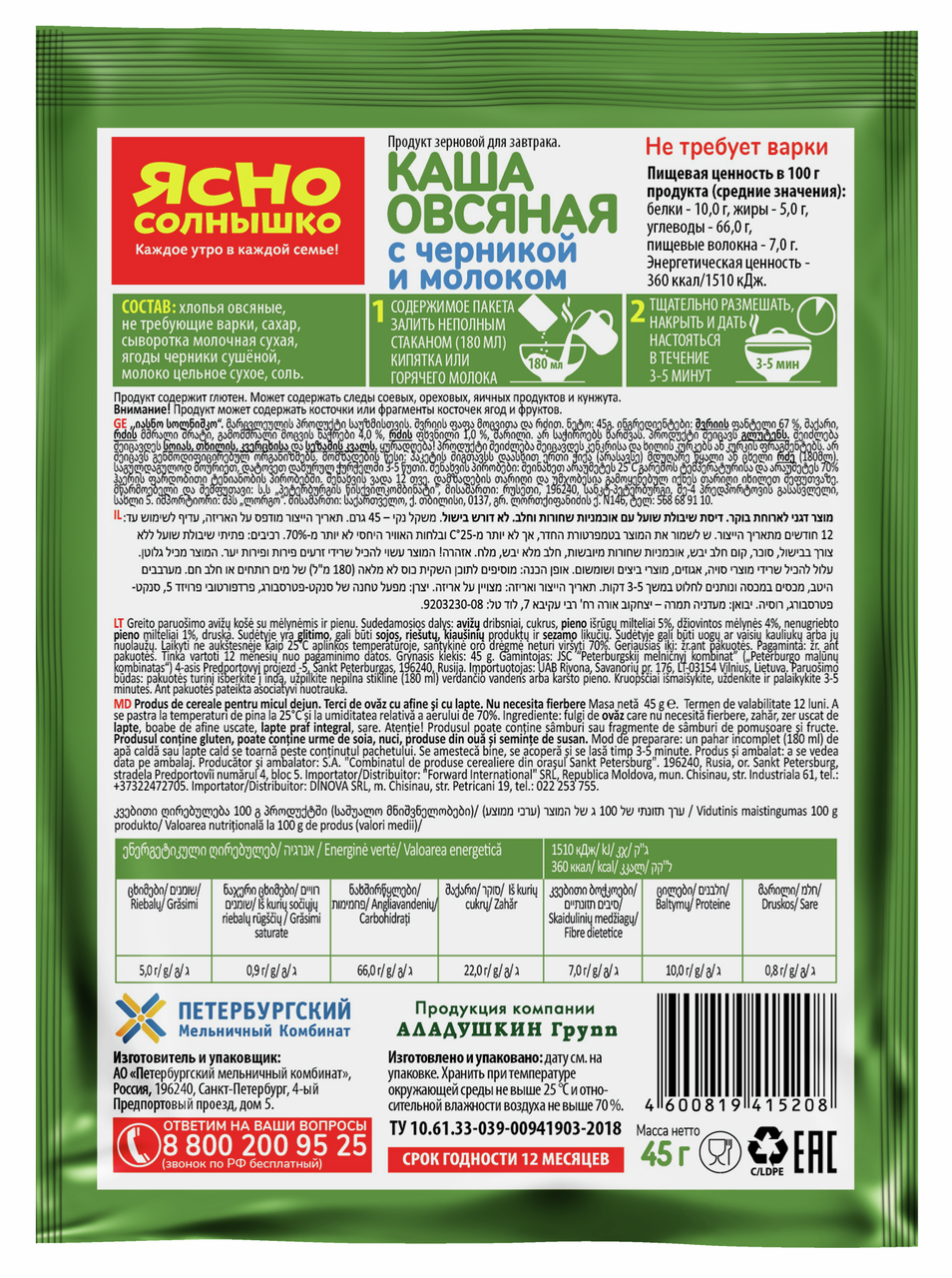 Каша овсяная Ясно солнышко с черникой и молоком, 45г x 15 шт - это каша моментального приготовления, не требующая варки. Она сделана из натуральных ингредиентов без добавления ароматизаторов, консервантов, красителей и стабилизаторов. В ее состав входят овсяные хлопья, обработанные по технологии двойного пропаривания, сушеные ягоды отборной черники, цельное сухое молоко, немного сахара и соли. Готовить ее проще простого: переложите смесь в тарелку, залейте 180 мл кипятка или горячего молока, оставьте под крышкой на 3-5 минут и наслаждайтесь вкусным и полезным завтраком.