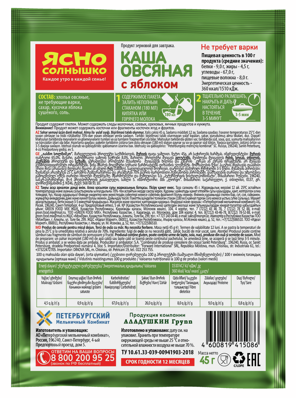 Каша овсяная Ясно солнышко с яблоком, 45г x 15 шт - нежная консистенция, дополненная вкусом ароматного яблока, никого не оставит равнодушным. В составе используются только натуральные компоненты. Упаковка компактная и легко открывается. Объем порции подходит и ребенку, и взрослому.