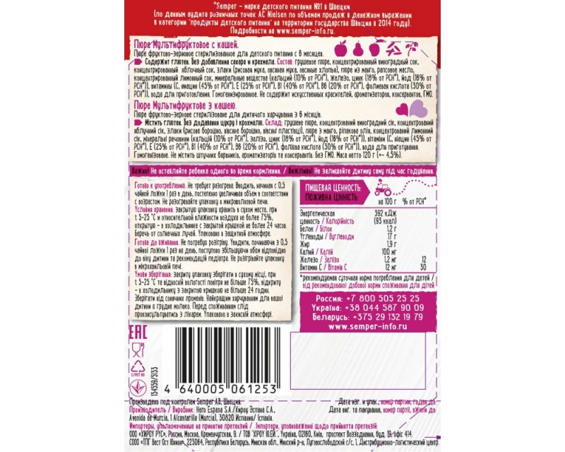 Вернуться назад Каша Semper с фруктовым пюре мультифруктовое, 120г Оставить отзыв Артикул: 581068 Поделиться В избранное Нет в наличии Посмотреть похожие Бренд SEMPER Страна-производитель Испания Подробнее Описание Cостав короба: 12шт. Полное описание Характеристики Бренд SEMPER Страна-производитель Испания Нет в наличии Посмотреть похожие