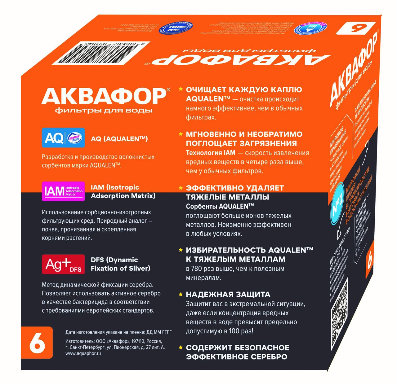 Модуль Аквафор В6 (В100-6) очищает водопроводную воду от самых распространенных вредных примесей, включая хлор, органические соединения (в том числе фенолы), тяжелые металлы, известковый налет, а так же уменьшает образование накипи в чайнике, мультиварке и кофемашине. Используется в кувшинах Аквафор c круглым гнездом посадки для картриджа диаметром 7 см. Ресурс сменного модуля - 300л.