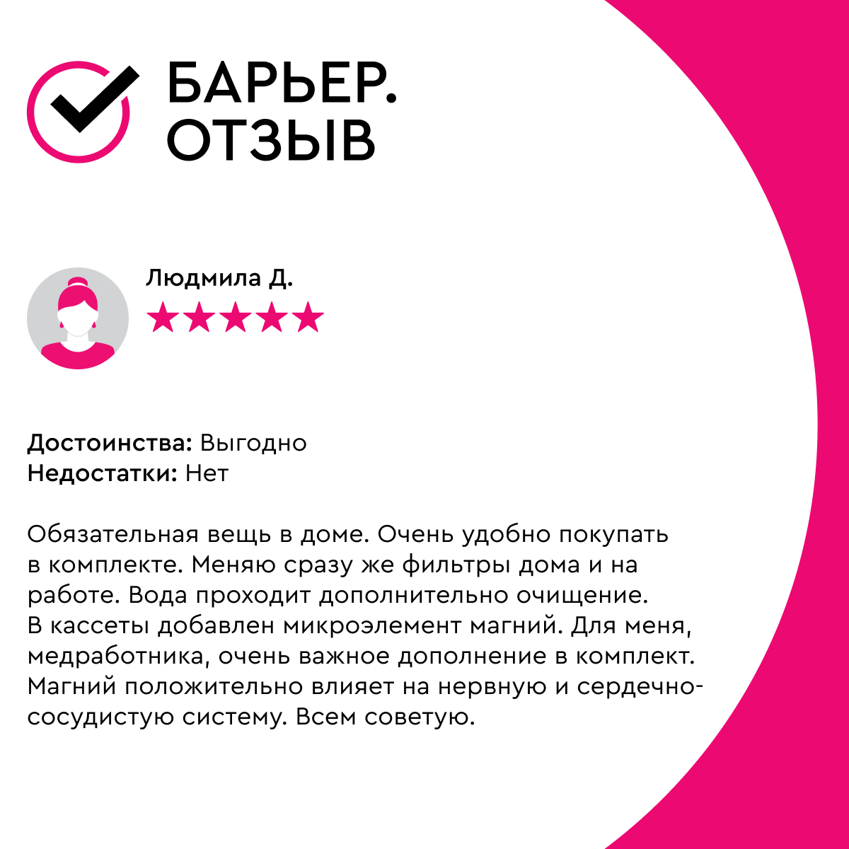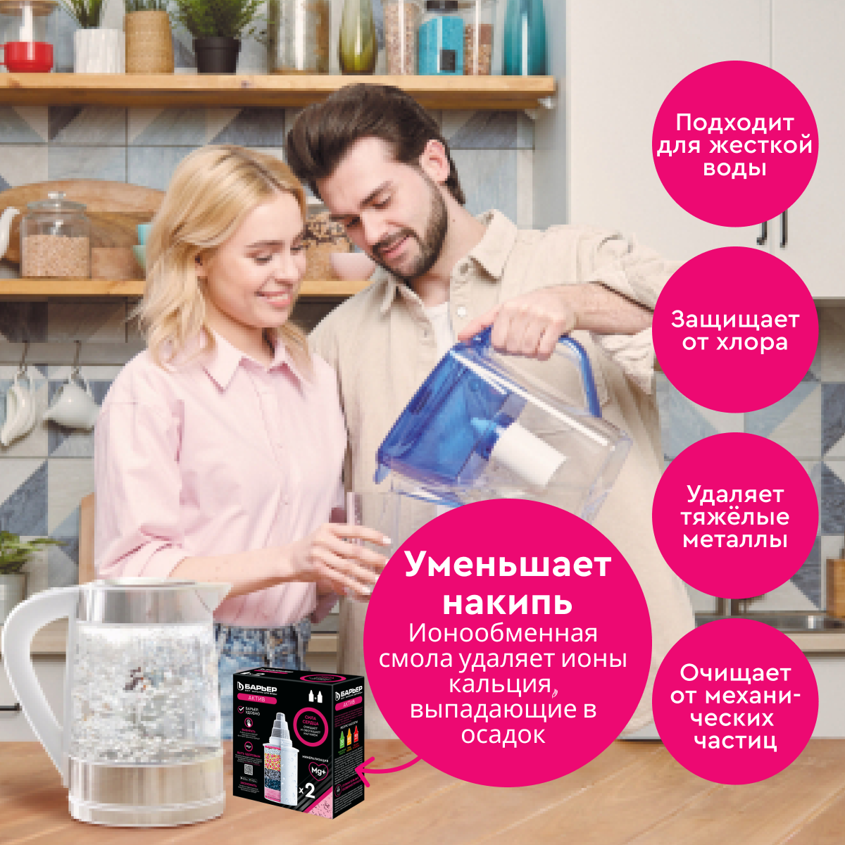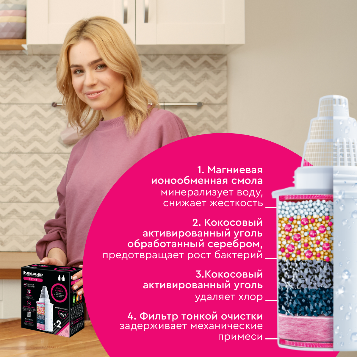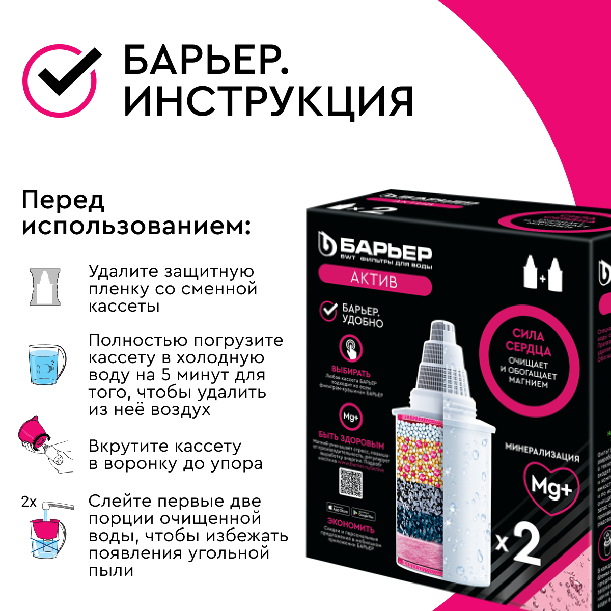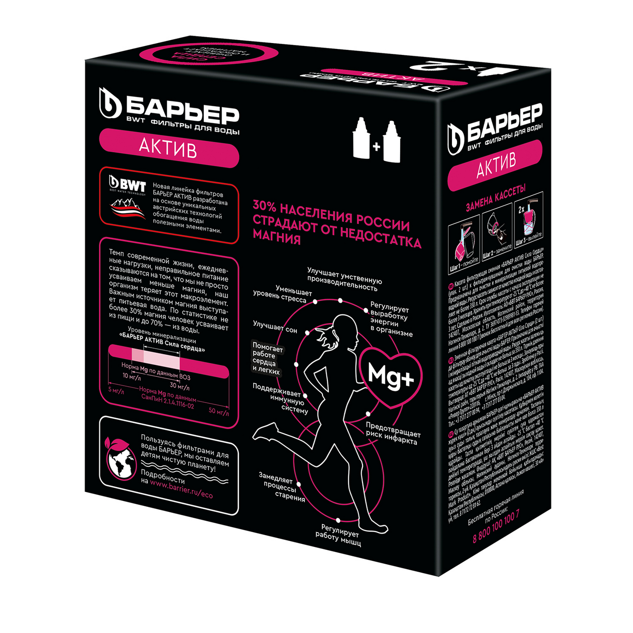 Кассеты для фильтра-кувшина Барьер Актив сила сердца поставляется в комплекте 2 шт. Они предназначены для очищения и минерализации. С их помощью можно насыщать воду магнием, необходимым для полноценного функционирования внутренних органов и систем. Магний играет для организма важную роль: он контролирует работу нервной системы, повышает настроение и снижает уровень стресса. Активный компонент поддержив��ет иммунную систему и возвращает жизненный тонус. Кассеты-фильтры защищают водопроводную воду от хлора и вредных примесей, позволяя наслаждаться полезным чаепитием и готовить первые блюда на очищенной воде. Также аксессуар для фильтра-кувшина препятствует образованию накипи в чайнике, удаляет металлический привкус водопроводной воды и посторонние запахи. Его ресурс рассчитан на 350 л. Так как в наборе Барьер Актив поставляется два прибора, то их хватает для семьи из 3-4 человек. Конструкция кассеты получила герметичное резьбовое крепление кассеты к воронке кувшина посуды, поэтому исключает попадание загрязненной воды в отфильтрованную воду. Особенностью модели стало наличие в фильтрующем элементе сорбционных веществ. Они эффективно очищают любую загрязненную воду, поддерживают здоровье всех членов семьи и предупредить ряд заболеваний, связанных с отравлениями, инфекциями и вирусами. Как только ресурса кассеты исчерпывается, требуется замена фильтра.