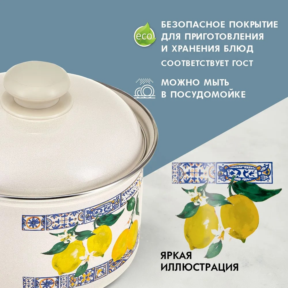 Кастрюля Hitt с крышкой Лимонная мозаика 2 л, 16 см выполнена из высококачественной стали с эмалированным покрытием. Оно защищает от коррозии, придает посуде гладкую стекловидную поверхность и надежно защищает от кислот и щелочей. Эмаль не вступает во взаимодействие с продуктами и не искажает их вкусовые качества. Прочный стальной корпус обеспечивает эффективную тепловую обработку пищевых продуктов и не деформируется в процессе эксплуатации. Крышка плотно прилегает к краям посуды, сохраняя аромат и вкус блюд. Крышка оснащена удобной ручкой. С внешней стороны эмалированная кастрюля оформлена симпатичным рисунком. Подходит для всех плит, включая индукционные. Можно мыть в посудомоечной машине.