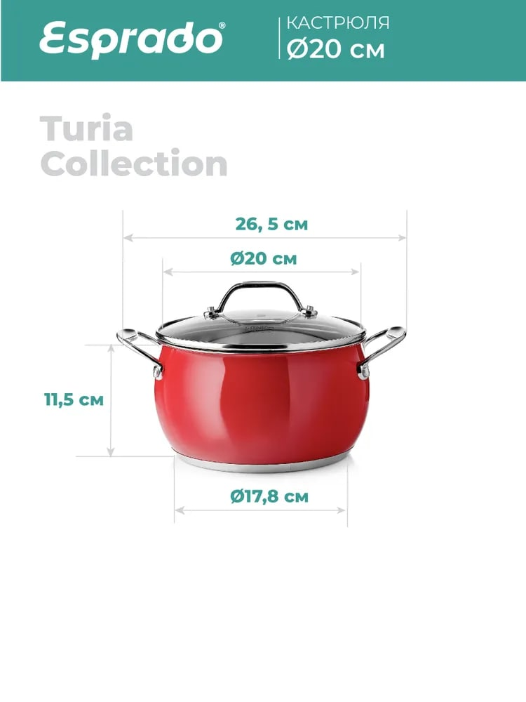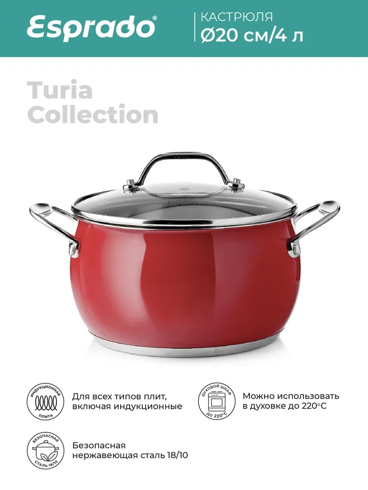 Кастрюля Esprado Turia 4 л, 20 см изготовлена из высококачественной нержавеющей стали. Она поставляется в комплекте с крышкой из стекла и стали и металлической ручкой. Коллекция посуды Turia меняет представление о классической посуде из нержавеющей стали. Уникальная округлая форма в ярком цвете придает ей неповторимый внешний вид. Высококачественная нержавеющая сталь, из которой выполнен корпус изделия, гарантирует долгую службу. Ручки эргономичной формы надежно прикреплены к корпусу с помощью заклепок. Посуду Turia можно использовать на всех типах плит и в духовке (до 220 градусов).