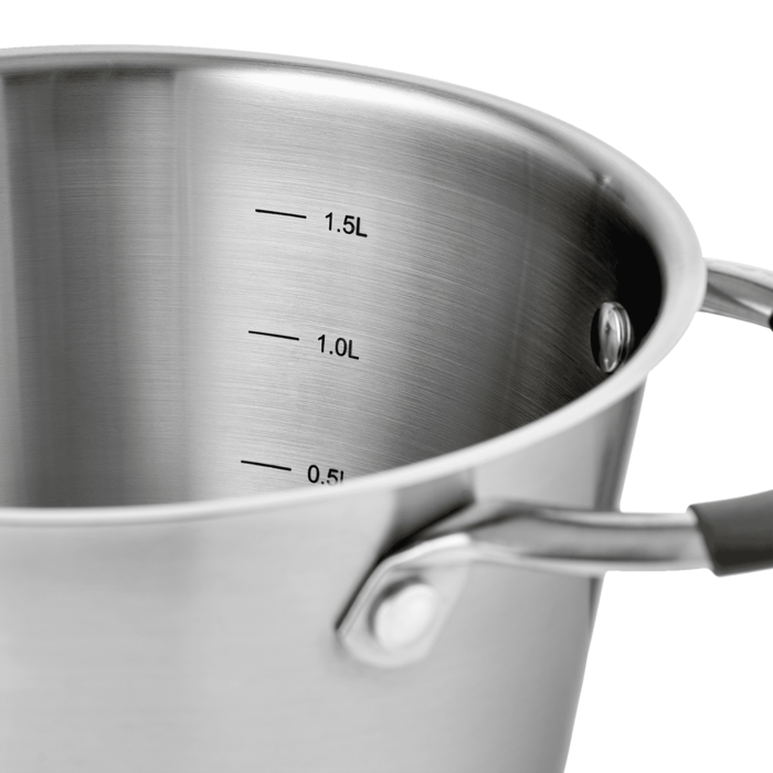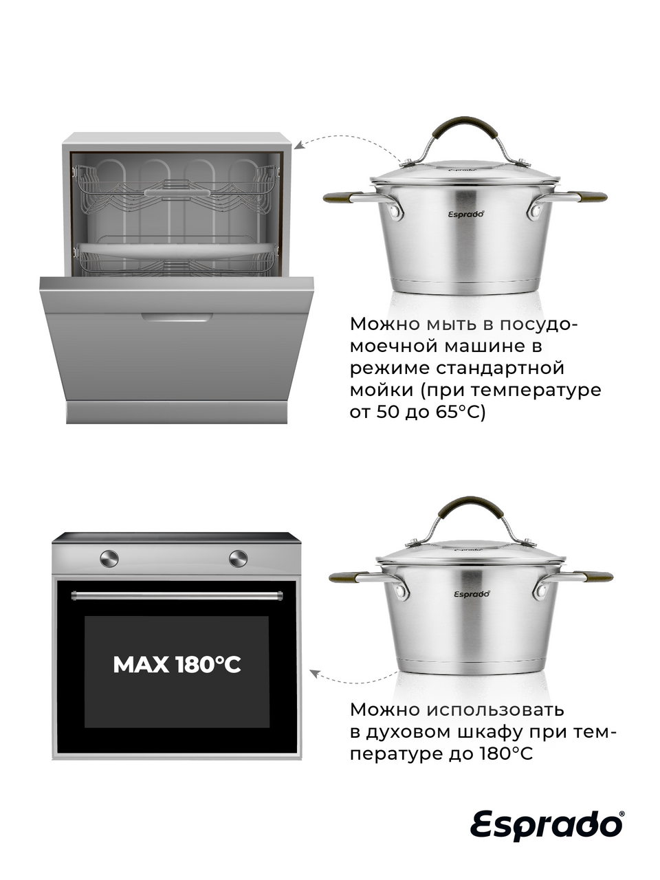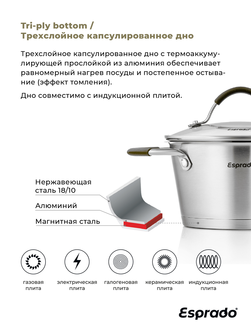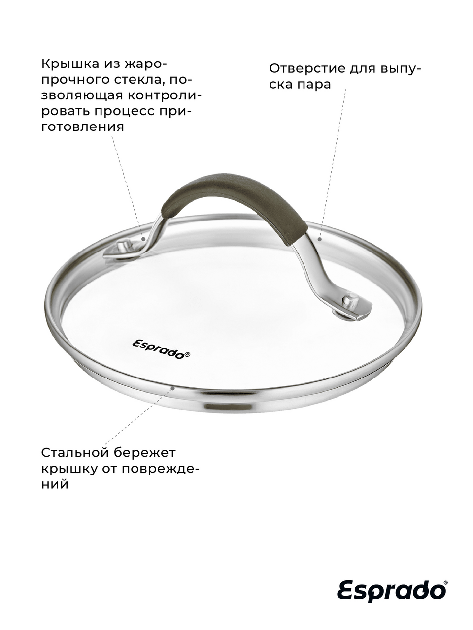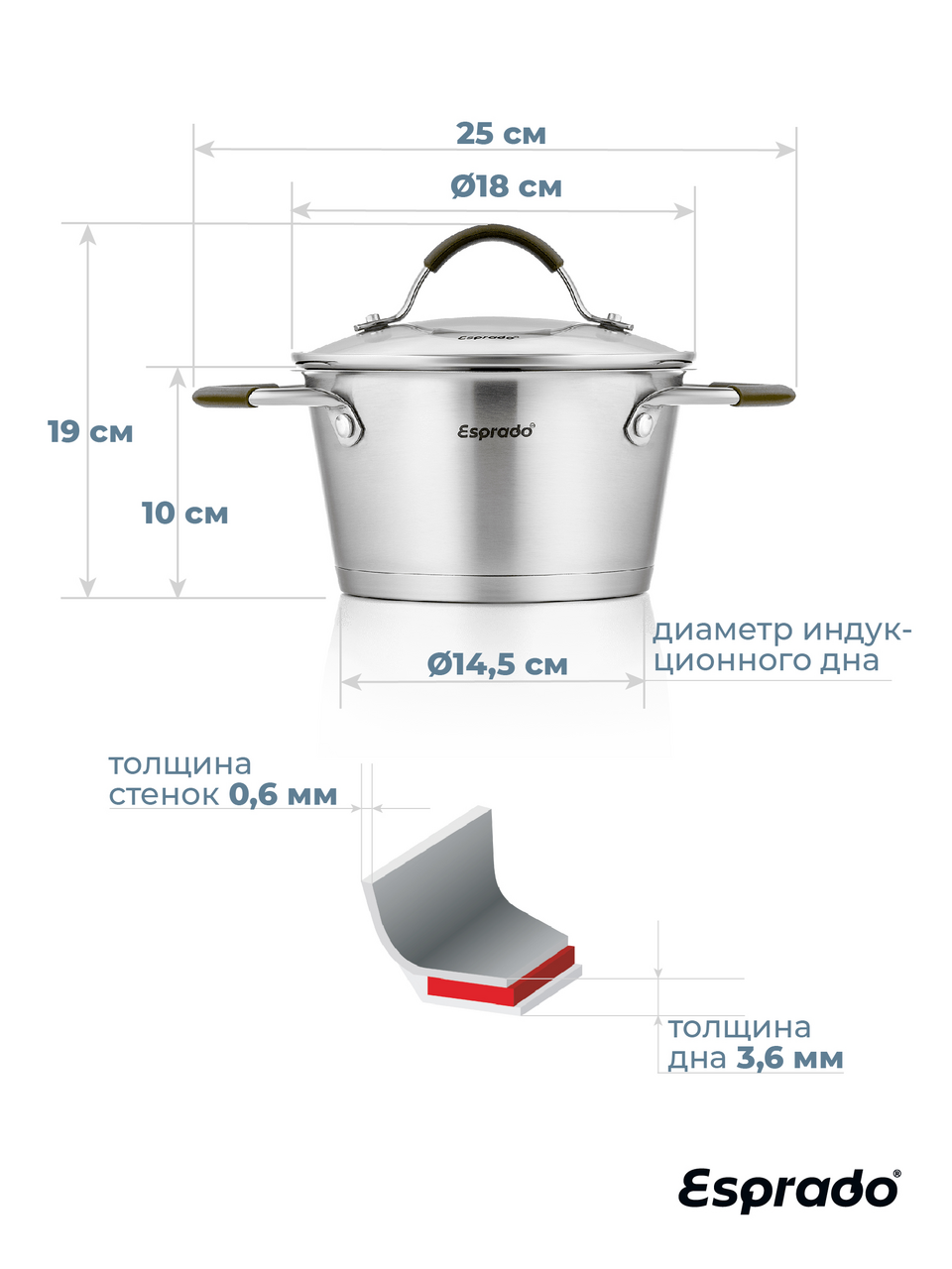 Кастрюля с крышкой Esprado Olivera 2,2 л, 18 см производится из высококачественной нержавеющей стали, а крышка — из термостойкого стекла. Материал долговечен и устойчив к деформации. Силиконовые вставки позволят обходиться без прихваток. Отметки литража на внутренней стороне кастрюли помогут отмерить нужный объем жидкости без мерной емкости. Трехслойное капсульное дно с прослойкой из алюминия гарантирует равномерный нагрев изделия по всей поверхности. Особенность кастрюли — ее равномерное и быстрое нагревание, что позволяет экономить время и энергию при готовке. После использования посуду можно мыть в посудомоечной машине и использовать на всех типах плит, включая индукционные.