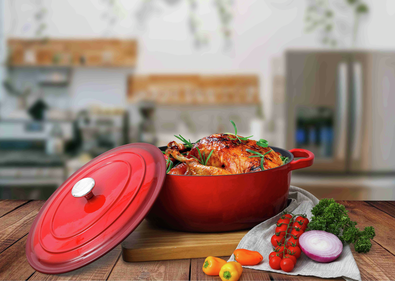 Чугунная кастрюля с крышкой и держателем для крышки обладает толстыми стенками, благодаря этой особенности в посуде можно тушить и варить на плите или в духовом шкафу. Отлично подойдёт для приготовления жаркого, тушенного кролика, птицы, гуляша или плова. Изделие выполнено из эмалированного чугуна материал обладает низкой теплопроводностью, поэтому медленно нагревается и распределяет тепло равномерно по всей поверхности. Долго остывает, поэтому кастрюлю можно снять с огня, и блюдо ещё долго будет оставаться горячим. Такая посуда станет идеальным выбором для любителей тушеных блюд.